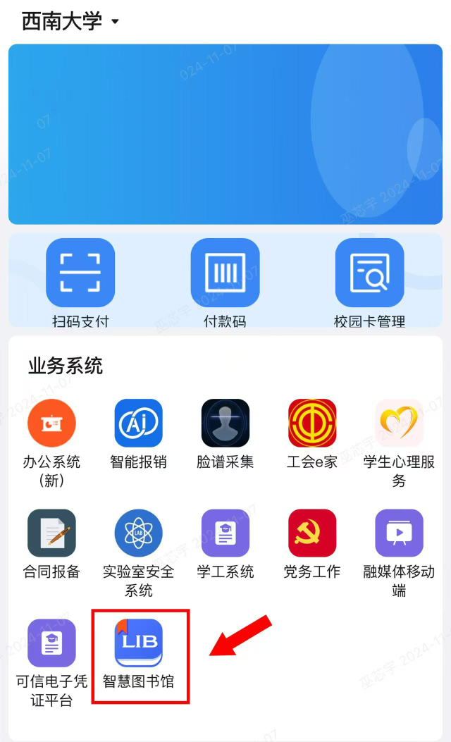 “数智西大”(钉钉)-“工作台”-“智慧图书馆”,如图所示: