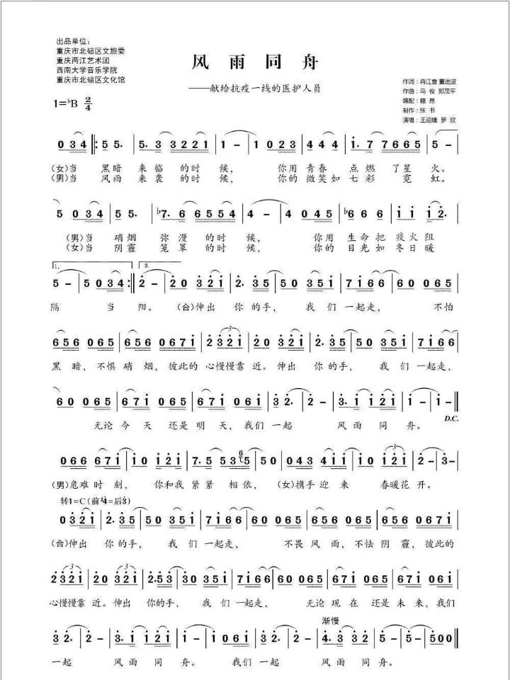 “由于有时差,经常我们一边是半夜,一边是白天,有时候她有灵感了半夜就给我视频把我叫醒。经过多次修改,歌曲《风雨同舟》也有了雏形。后来曲子经过我们音乐学院郑茂平院长的修改,两江音乐团的籍昂老师编曲,还有董进波老师与我太太的共同填词,最终耗时一周完成。”马骏介绍道。