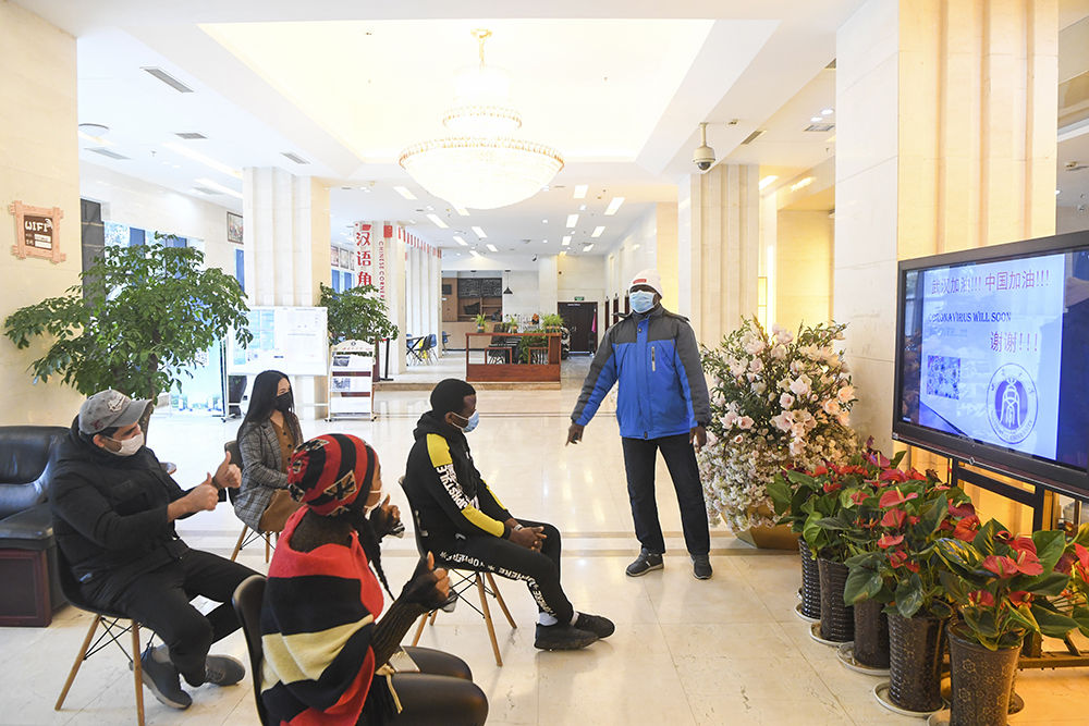 2月18日,贝博艾弗森代言体育官网尼日利亚籍留学生志愿者穆斯塔法(右一)与留学生志愿者分享疫情防控相关知识。 新华社记者王全超摄