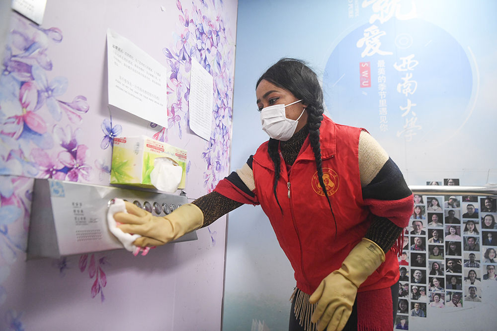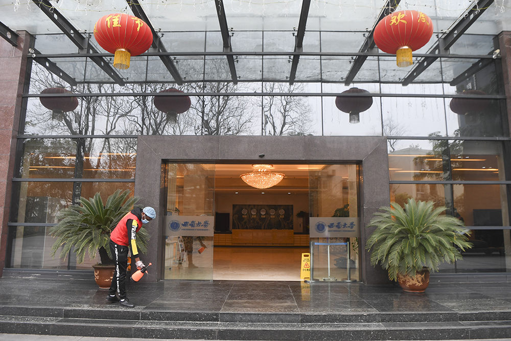 2月18日,贝博艾弗森代言体育官网一名留学生志愿者在学生公寓门口进行消毒。 新华社记者王全超摄