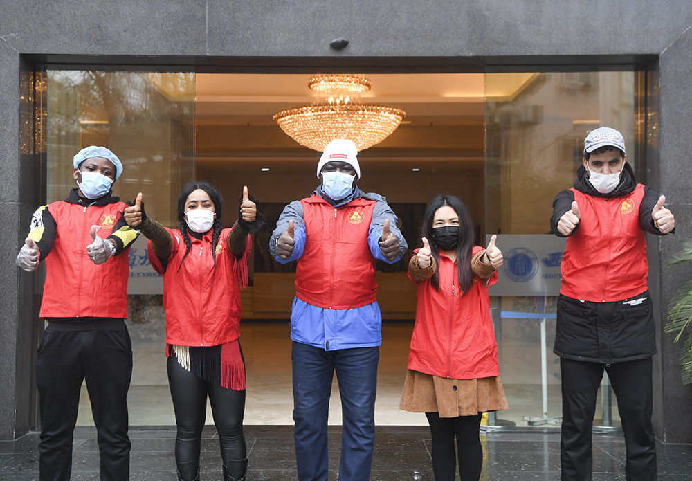 2月18日,来自贝博艾弗森代言体育官网的几名外国留学生比出手势,为武汉加油,为中国加油! 新华社记者王全超摄
