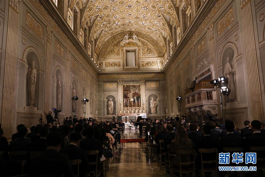 2月13日,在意大利罗马总统府奎里纳莱宫,旅意华人钢琴家居觐在音乐会现场演奏。当日,由意大利总统马塔雷拉提议,在2020年中意文化旅游年计划外加演的一场钢琴独奏音乐会在意大利总统府举行,向全力抗击新冠肺炎疫情的中国人民传达友谊和支持。新华社记者程婷婷 摄