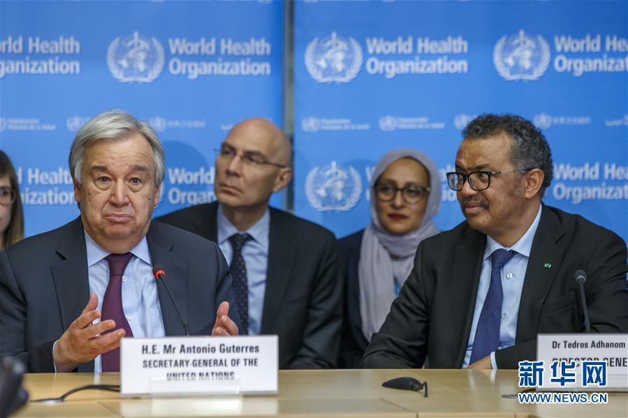 2月24日,在瑞士日内瓦,联合国秘书长古特雷斯(左)在世界卫生组织总部发表讲话。古特雷斯表示,中国人民为尽量减轻新冠肺炎疫情造成的负面影响,实施严格的防控措施,以牺牲正常生活的方式为全人类做出了贡献。新华社发