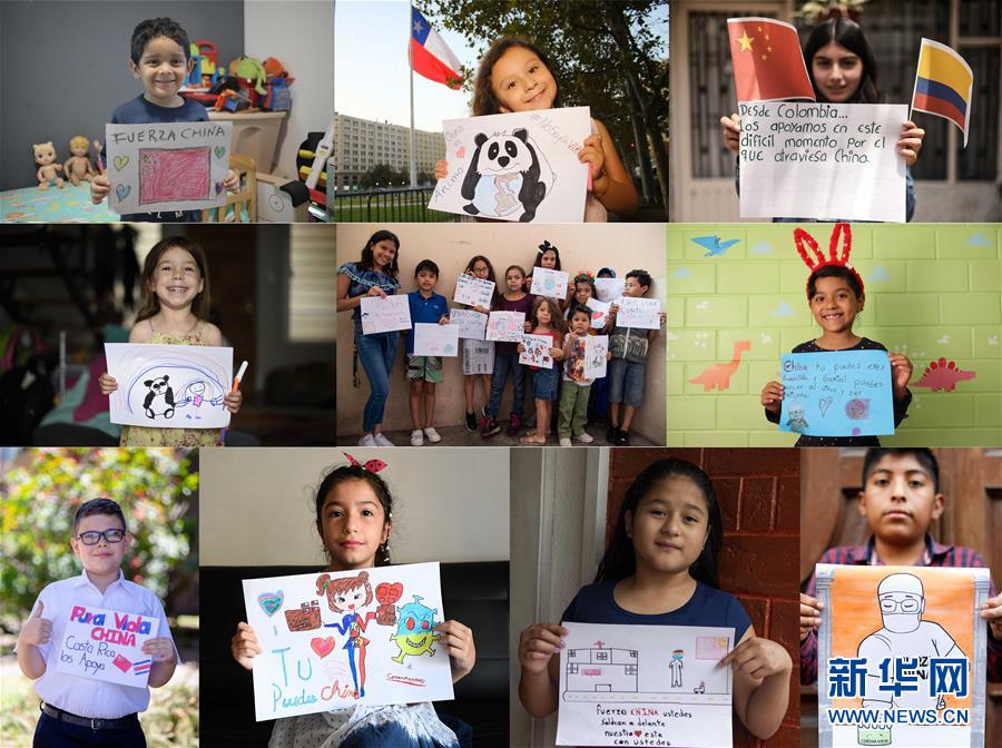 中国和拉丁美洲虽然距离遥远,但民心相通,当地民众关注着中国抗击新冠肺炎疫情的消息。在一些国家,孩子们拿起画笔,描绘出他们对中国的支持和鼓励,送上了远方的真挚祝福。这是拉丁美洲一些国家的孩子们与画作的合影的拼版照片。新华社发