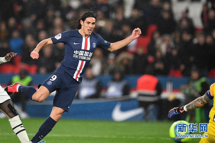 2月23日,巴黎圣日耳曼队球员卡瓦尼在对阵波尔多队的比赛中进攻。当日,巴黎圣日耳曼队球员身穿印有“中国加油”字样的球衣上场比赛。新华社发(杰克·陈 摄)