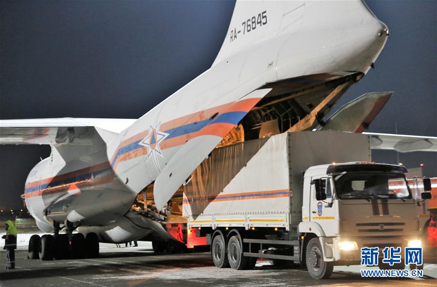 2月8日,在俄罗斯莫斯科附近的茹科夫斯基机场,工作人员将俄罗斯政府向中方提供的医疗援助物资装上运输机。新华社/卫星社