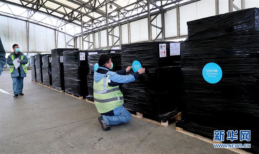 3月1日,由联合国儿童基金会从德国采购的口罩、防护服等疫情防控物资运抵上海浦东国际机场,工作人员为这批即将运往湖北的物资张贴标志。新华社记者 方喆 摄