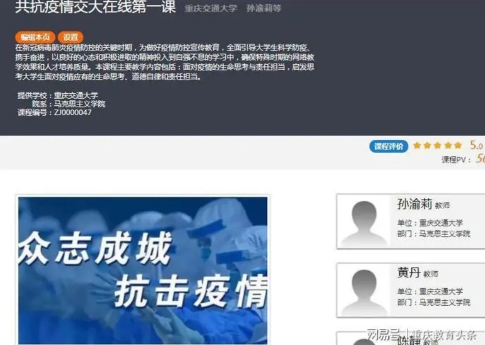 近日,重庆交通大学全体思政课教师以“面对疫情的生命思考与责任担当”为主题,向全校2万多名本科学生集中开展了新学期“交大在线第一课”的专题教学。课程结合抗击疫情的重大举措、感人事迹、生动故事等素材,从生命、道德和法治三个角度,引导大学生思考生命的价值、道德的意义和法治的作用,强化新时代的大学生在抗疫时期应有的责任担当。