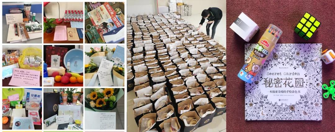 学校精心为提前返校学生准备了“生活关爱礼包”,包括牛奶、面包、蛋糕、坚果、巧克力、水果、生活用品等,“心·关爱”礼包,包含《秘密花园涂色书》、彩笔、减压小物件。各培养单位也根据学生需求和学院特色,准备了丰富的关爱物资。