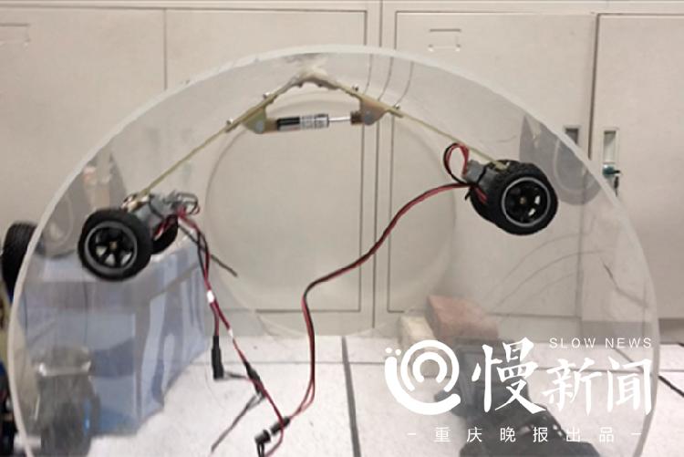 为此,该团队研发了一款小于管道内曲面直径的新型非磁性弧面攀附移动机器人,机器人机体主要由前向驱动模块、后向驱动模块和机身三大模块组成,前向驱动模块为单驱动双轮结构,即由一个电机驱动两个行动轮转动;后向驱动模块为双驱动结构,即两个电机分别驱动两个行动轮运动,两个行动轮的差速可以调整机体姿态和实现转向;机身由两个宽杆、连接轴和支撑杆三部分组成。“通过弹性(液压、气压或者弹簧)支撑杆的作用,机体外张使得轮组对管壁产生足够的压力,从而满足攀爬和运动的需求。”团队表示,机器人机身整体形状像一段圆弧,弧状的形态学优势更有利于机器人在狭窄的GIS内壁运动,并可以360度环向运动和前后移动,抵达任意需要的位置。可用于输油、输气管道的大型勘测。