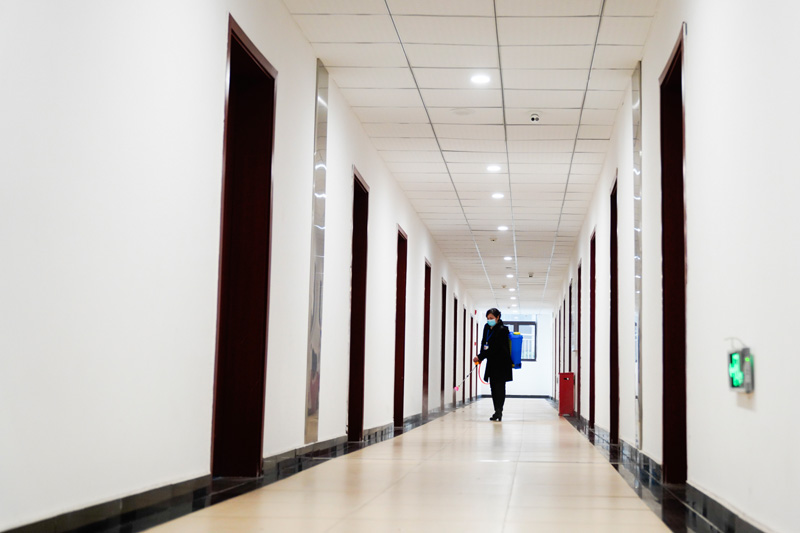 2月1日,在贝博艾弗森代言体育官网一学生宿舍,宿管人员在走廊进行消杀作业。