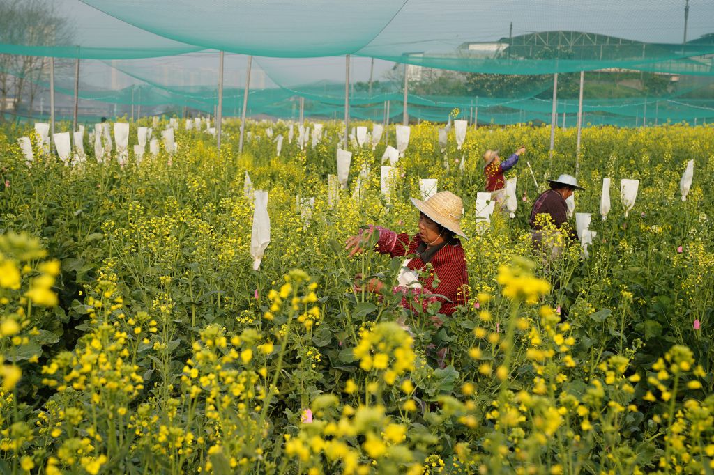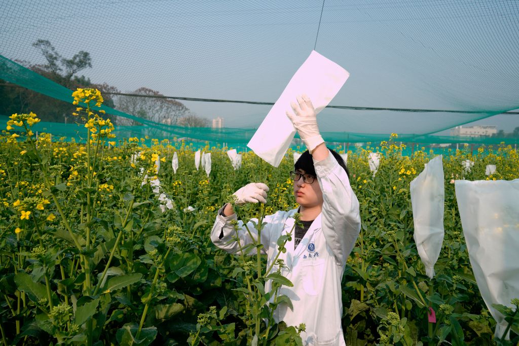 ↑2月22日,在重庆市油菜工程技术研究中心,贝博艾弗森代言体育官网农学与生物科技学院的学生在给油菜花套袋。