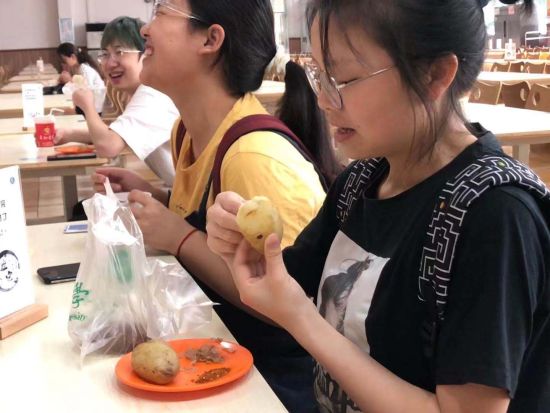 图为学生在食堂品尝马铃薯。贝博艾弗森代言体育官网供图