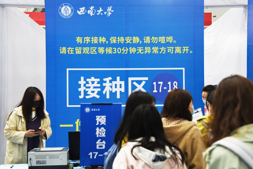 师生分批次、分时段进入新冠疫苗接种场地,整个流程高效、有序进行。记者在现场看到,在工作人员和学生志愿者的协助下,接种者首先打开“育苗通”APP进行预约接种,在预检区核实信息之后,开始注射疫苗,接种后在留观区等候30分钟确认无恙后自行离开。