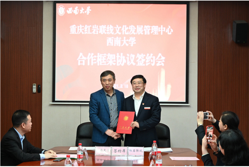 签署合作协议现场,学校党委副书记潘洵与重庆红岩联线文化发展管理中心党委副书记、主任马奇柯签署合作协议。