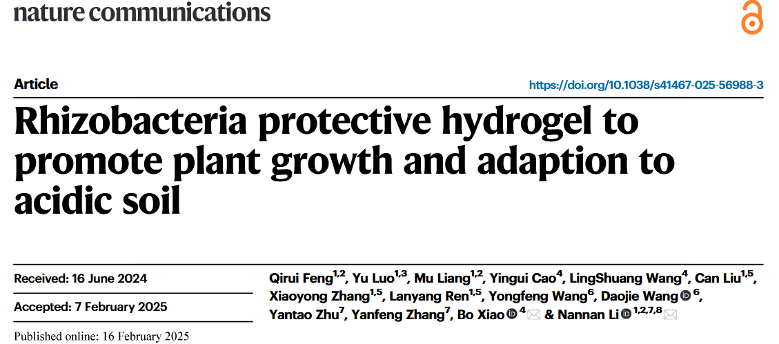 2月16日,国际著名期刊《自然通讯》(Nature Communications)在线发表了资源环境学院李楠楠教授团队与蚕桑纺织与生物质科学学院肖波教授团队的研究论文《用于包裹根系内生菌的水凝胶可以促进植物生长和抵御酸性土壤》(Rhizobacteria protective hydrogel to promote plant growth and adaption to acidic soil)。该论文研究开发了一种聚合水凝胶,可以提高植物根系促生菌在不同植物中的促生效率并减轻酸性胁迫。