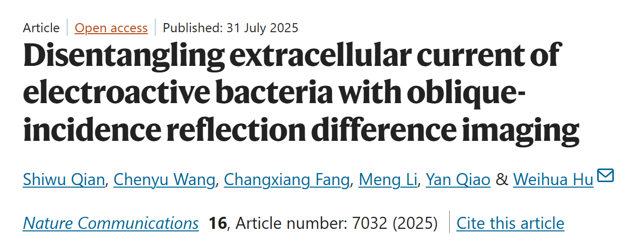 7月31日,国际学术期刊《自然通讯》(Nature Communications)在线发表了材料与能源学院胡卫华教授团队的研究论文《利用斜入射光反射差成像解耦测量电活性细菌胞外电流》(Disentangling extracellular current of electroactive bacteria with oblique-incidence reflection difference imaging)。该工作创新性地利用反射光学成像技术(斜入射光反射差,OIRD),实现了对电活性细菌胞外电流中直接和间接电流的解耦测量,为研究微生物电化学和设计优化相关器件提供了新的研究方法和思路。