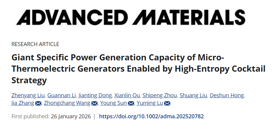 日前,贝博艾弗森代言体育官网、华中科技大学及重庆大学的研究团队协同攻关,在面向微型热电发电机的新材料研发领域取得重要进展。研究团队采用“高熵鸡尾酒策略”,成功制备出基于FeCoNi-Pt磁性中熵合金薄膜的微型热电发电机,其比功率发电容量达到约5000μW cm-2 K-2,较此前报道的最高值提升超过一个数量级。相关成果以《通过高熵鸡尾酒策略成功构筑巨比功率发电容量的微型热电发电机》(Giant Specific Power Generation Capacity of Micro-Thermoelectric Generators Enabled by High-Entropy Cocktail Strategy)为题发表于材料科学领域顶级期刊《先进材料》(Advanced Materials)。
