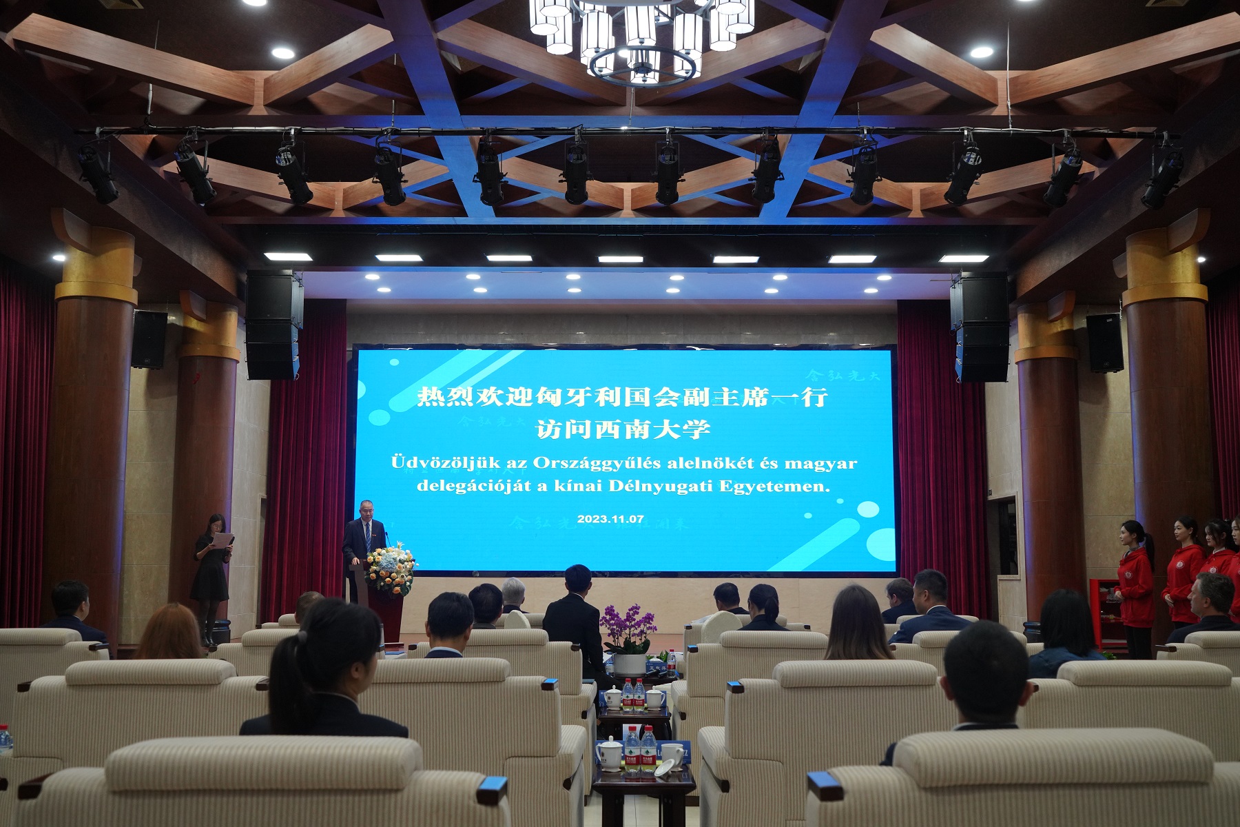 11月7日下午,匈牙利国会副主席雅高布·伊什特万率团来校访问。匈牙利驻重庆总领事馆总领事百里、匈牙利驻华大使馆科技参赞鲍洛安、匈牙利农业与生命科学大学国际关系与外事主任班齐大卫等一行10人陪同来访;科技部国际合作司派欧亚处二级调研员段予莹来校参加活动。