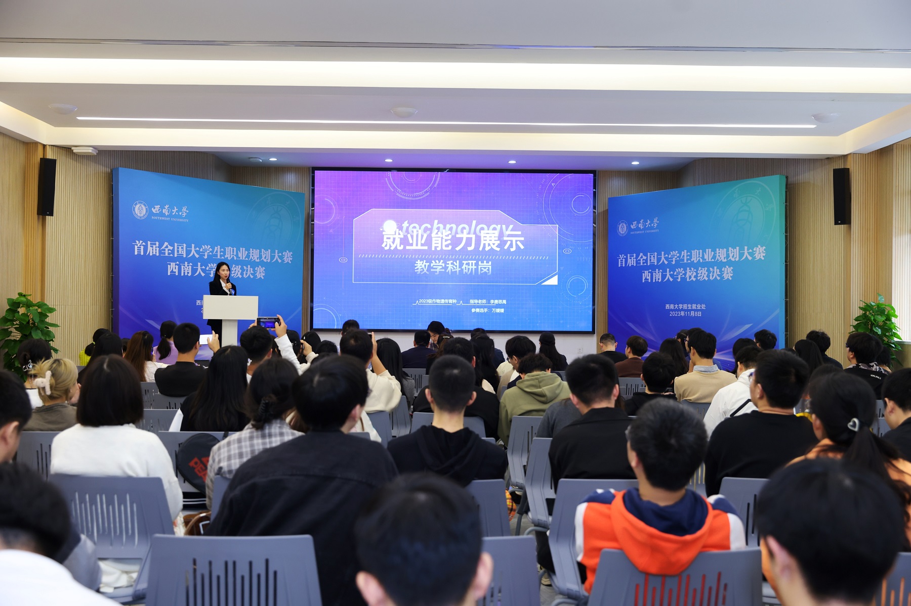 大赛由学校主办,招生就业处承办。创新创业学院院长张斌、重庆师范大学经济与管理学院党委书记钟敏、重庆两江新区教育发展研究院院长曾万学、子兮未来文化传媒有限公司董事长张元曦、万学创世教育科技有限公司总裁曾劲以及重庆药友制药有限公司人力资源部经理邓自鑫担任评委。大赛分为成长赛道和就业赛道,成长赛道设置主题陈述和评委提问两个环节,就业赛道设置主题陈述和综合面试两个环节。主题陈述环节,选手们结合自身兴趣和专业特点,对自我认识和外部环境进行了全面的分析,提出了自己的职业目标、发展路径和行动规划,并从可操作性和现实意义等方面进行了细致阐述。评委提问和综合面试环节,选手们沉着冷静,反应迅速,思路清晰。