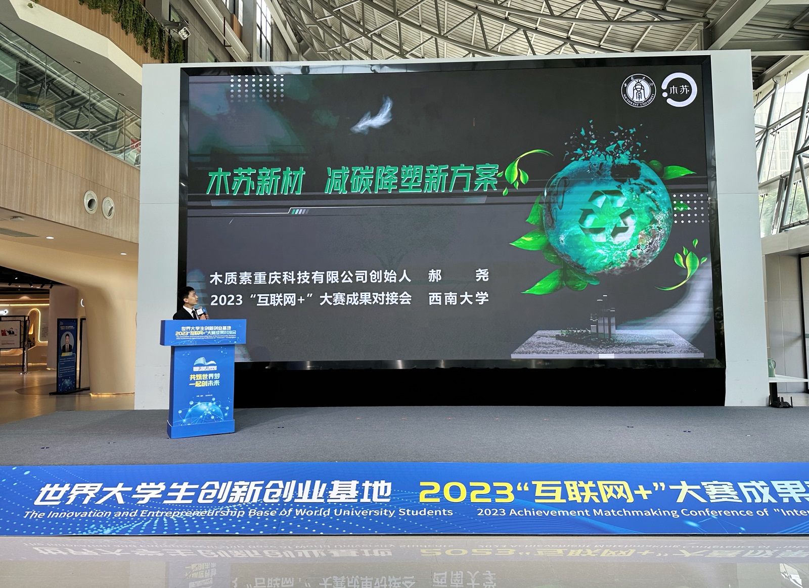 第八届“互联网+”国赛金奖项目《木苏新材,废液重生——减碳降塑新方案》项目负责人郝尧进行现场路演,获得企业、科研院所、创投机构负责人的一致好评。