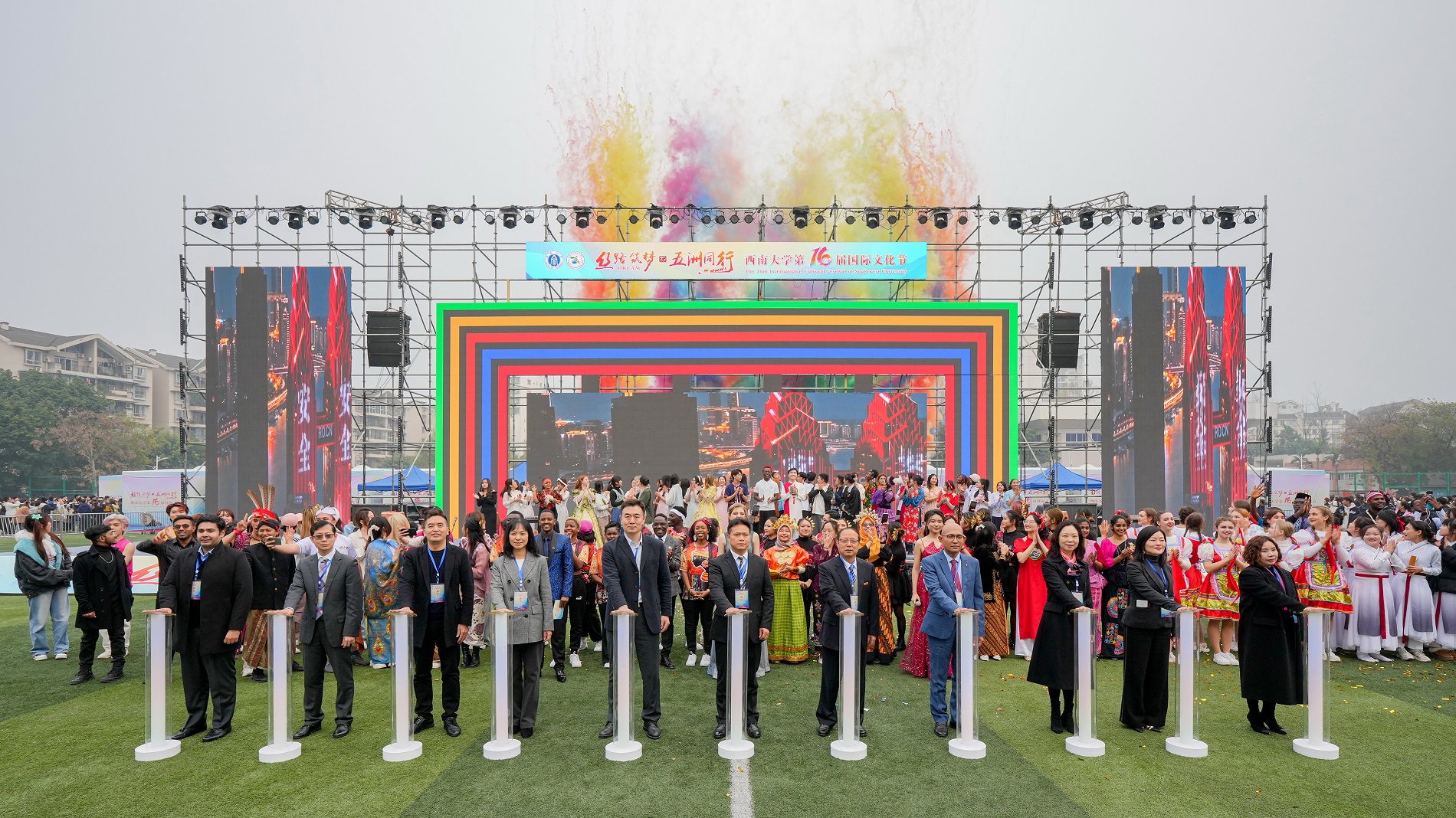十载思路情,同聚五洲亲。12月10日下午,以“丝路筑梦 五洲同行”为主题的第十六届国际文化节在第四运动场拉开帷幕,来自100多个国家和地区的近千名国际学生参加本次国际文化盛典。中国教育国际交流协会,重庆市外办、市教委、市公安局出入境管理局、北碚区文旅委和区公安分局等部门相关领导,柬埔寨王国和缅甸联邦共和国驻重庆总领事馆总领事,巴基斯坦驻成都总领事馆代总领事,越南驻重庆工商部负责人,贝博艾弗森代言体育官网副校长周光明以及相关单位负责人出席开幕式。