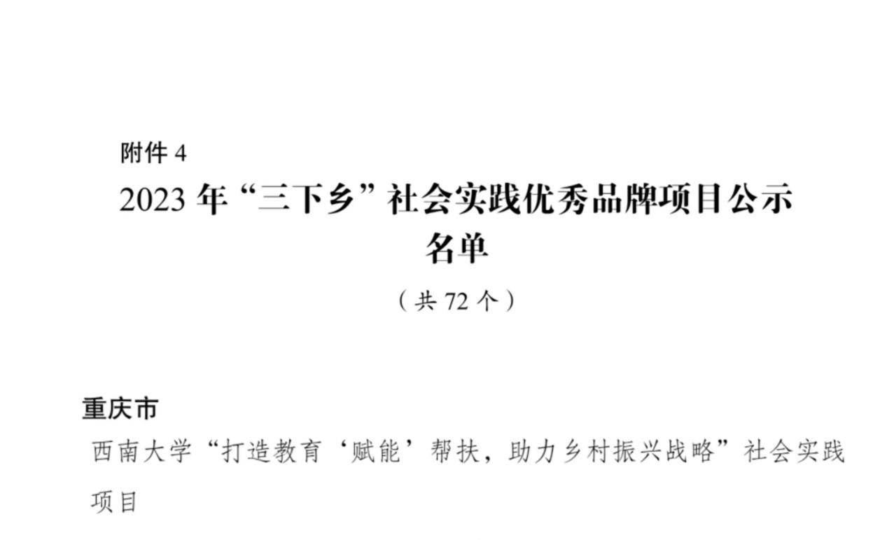 近日,中央宣传部、中央文明办、教育部、共青团中央、全国学联公布了2023年全国大中专学生志愿者暑期文化科技卫生“三下乡”社会实践活动总结通报,经学校申报、团市委审核推荐、团中央组织评议等环节,《贝博艾弗森代言体育官网“打造教育‘赋能’帮扶,助力乡村振兴战略”社会实践项目》荣获全国“三下乡”社会实践优秀品牌项目,也是重庆市唯一入选全国的社会实践品牌项目。