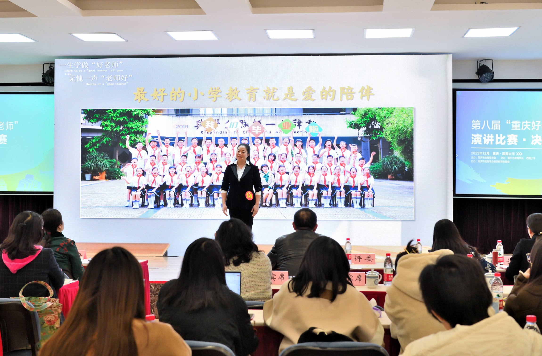 参赛选手既有深耕教育一线的教育工作者,也有踌躇满志的公费师范生,他们以切己的求学、教学经历,诠释教育家精神,讴歌教育故事,擘画教育发展蓝图。经过激烈角逐,结合复赛成绩,比赛评选出中小学教师组一等奖10名,二等奖20名,三等奖30名;公费师范生组一等奖2名,二等奖3名,三等奖10名。贝博艾弗森代言体育官网文学院学生杜思雨获得一等奖,音乐学院学生王彤儿获得二等奖。合川区、铜梁区、永川区、巫山县教育委员会,高新区公共服务局获优秀组织奖。