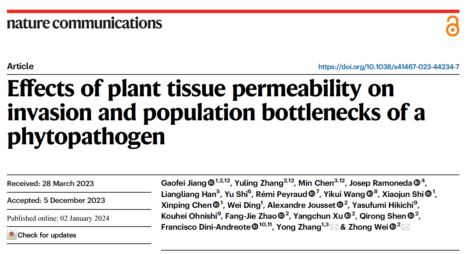 1月2日,《Nature Communications》在线发表了学校资源环境学院(长江经济带农业绿色发展研究中心)张勇教授与南京农业大学(LorMe实验室)沈其荣院士团队韦中教授合作的最新研究成果《Effects of plant tissue permeability on invasion and population bottlenecks of a phytopathogen》。该研究通过建立高通量基因组等位基因标记技术,动态示踪微生物种群变化,突破了根际入侵过程中无法精细刻画致病菌种群动态变化的关键技术瓶颈,解析了根际免疫强度制约土传致病菌生态进化的过程与微生态机制,为土传致病菌的生态阻控提供理论基础和技术支撑。