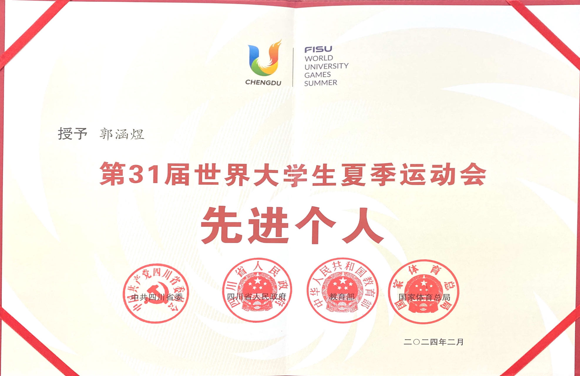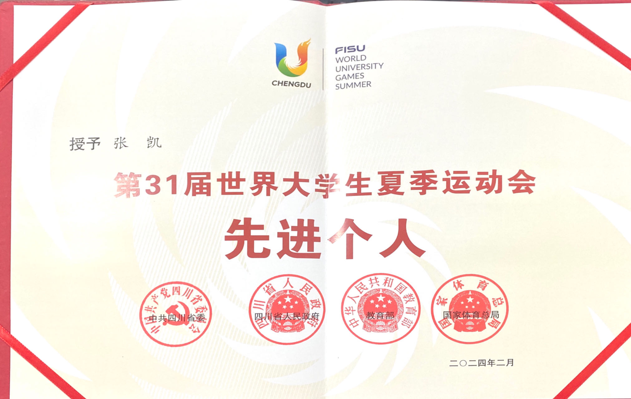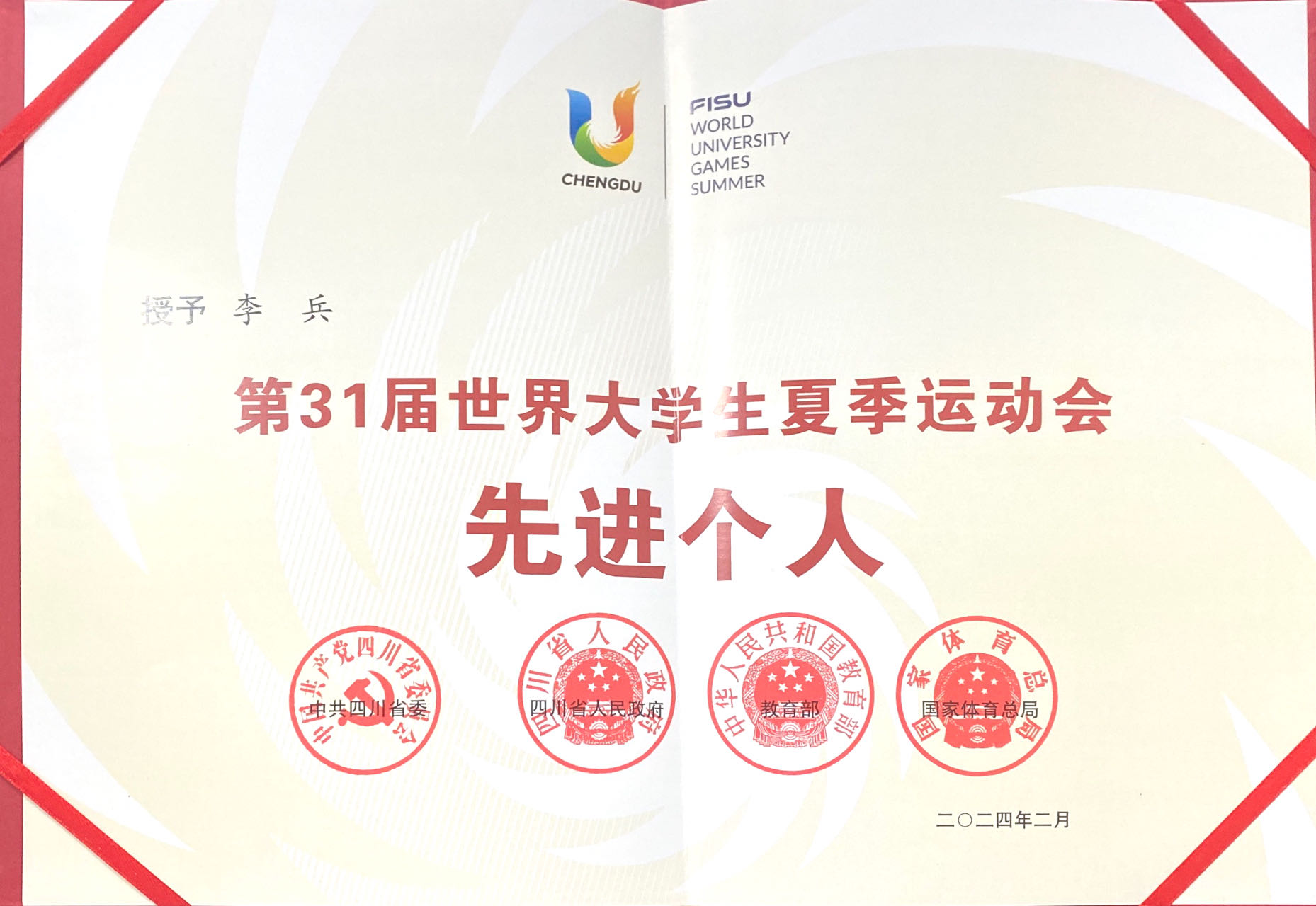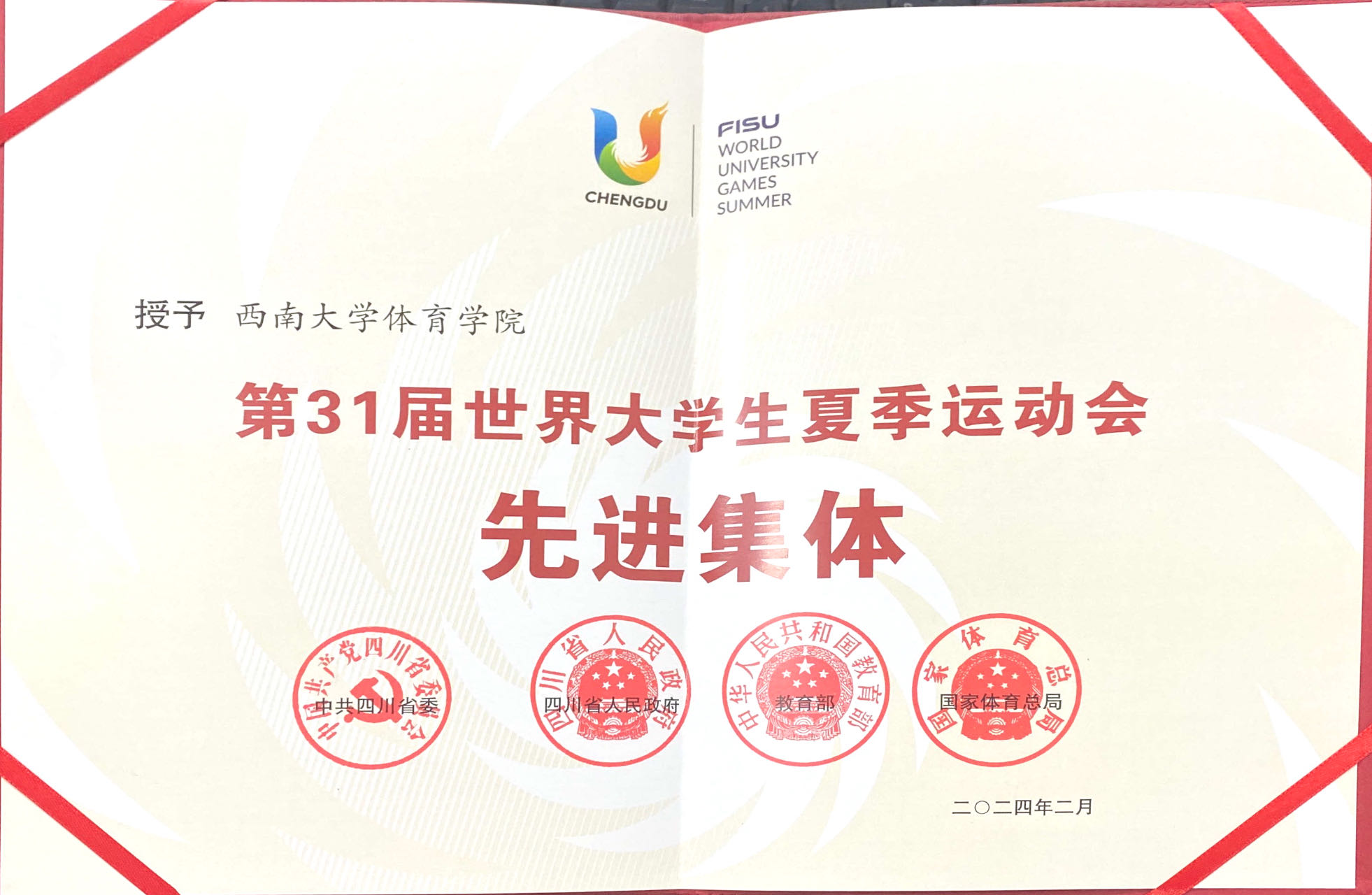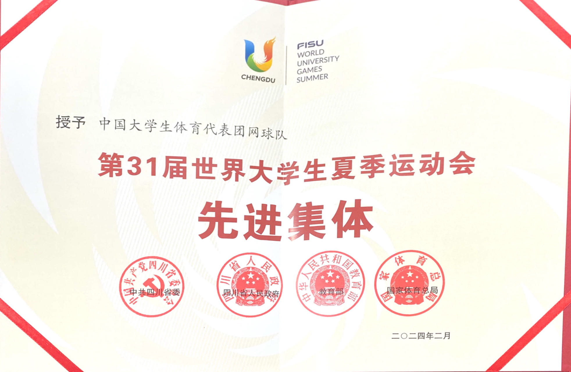 近日,中共四川省委、四川省人民政府、教育部、国家体育总局联合发布《关于表彰第31届世界大学生夏季运动会先进集体和先进个人的决定》,中国大学生体育代表团网球队、贝博艾弗森代言体育官网体育学院被授予“第31届世界大学生夏季运动会先进集体”称号,李兵、郭涵煜、张凯等3名师生被授予“第31届世界大学生夏季运动会先进个人”称号。