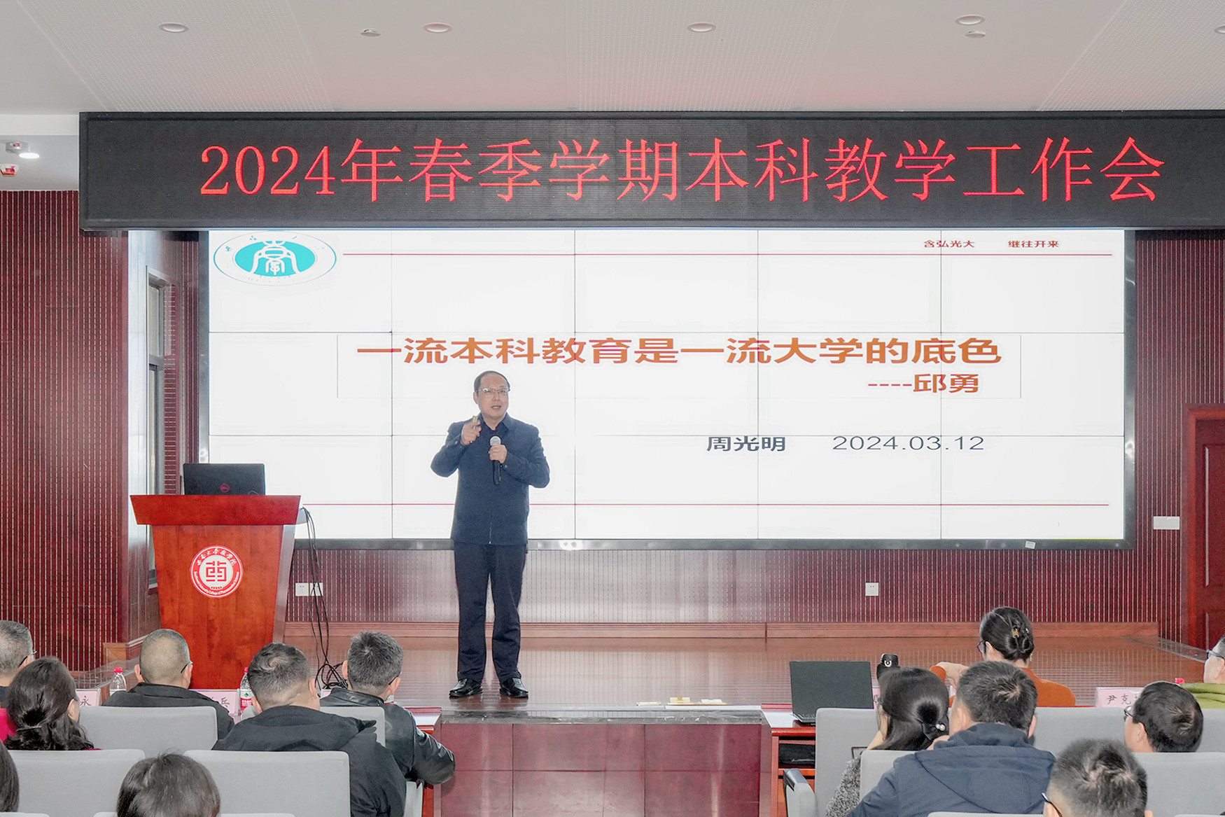 为进一步深化本科教育教学改革,推动高质量教育体系建设,全面提高人才自主培养质量,3月12日下午,学校召开2024年春季学期本科教学工作会,副校长周光明出席会议并讲话,教务处处长付志锋主持会议。