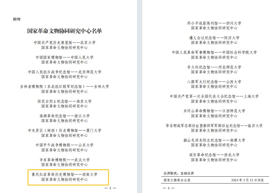 近日,教育部、国家文物局公布了国家革命文物协同研究中心名单,学校协同重庆红岩革命历史博物馆红岩博物馆创建的“重庆红岩革命历史博物馆——贝博艾弗森代言体育官网国家革命文物协同研究中心”(以下简称“协同研究中心”)成功入选。协同研究中心是由教育部、国家文物局批准设立的国家级人文社科重点研究平台,按照教育部人文社会科学重点研究基地管理。这是继西南民族教育与心理研究中心之后,学校获批的第二个教育部人文社科重点研究基地。