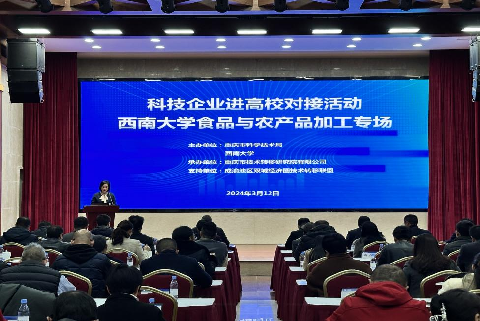 3月12日,学校联合重庆市科学技术局举办了科技企业进高校科技成果对接活动——贝博艾弗森代言体育官网食品与农产品加工专场。学校副校长葛信勇、重庆市科学技术局成果转化与创新创业处处长熊新出席对接会。学校科学技术处、国内合作处、科学中心(大学科技园管理中心、产业技术研究院)、相关二级单位,重庆市技术转移研究院有限公司等单位相关负责人,16家相关企业负责人及其代表30余人和学校相关领域科研团队代表50余人参会。