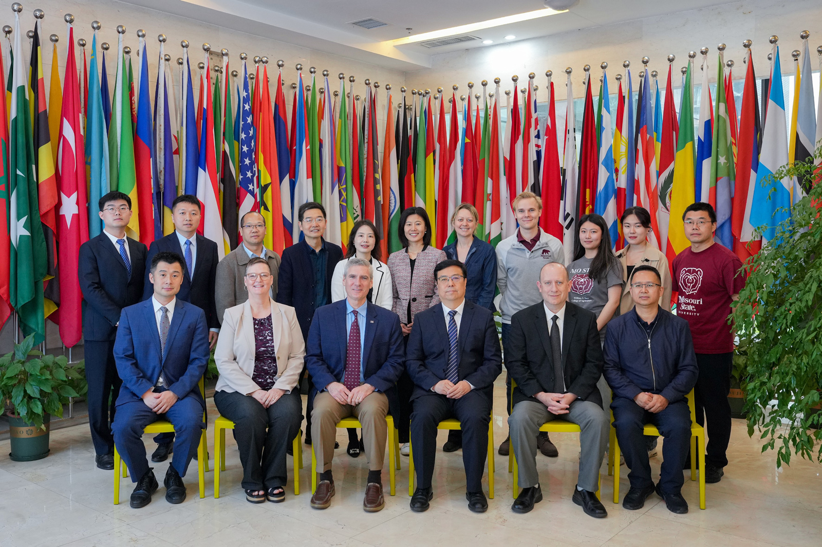 王进军对布拉德一行来访表示热烈欢迎。他指出,密苏里州立大学是学校非常重要的合作伙伴,双方合作基础深厚,前景广阔。两校联合举办植物科学与技术专业中外合作办学项目以来,合作关系不断发展,人员交流日益频繁,人才培养成果丰硕。希望两校以合作办学项目为基础,继续挖掘合作潜力,拓展合作领域,加强资源融合,丰富合作内涵。