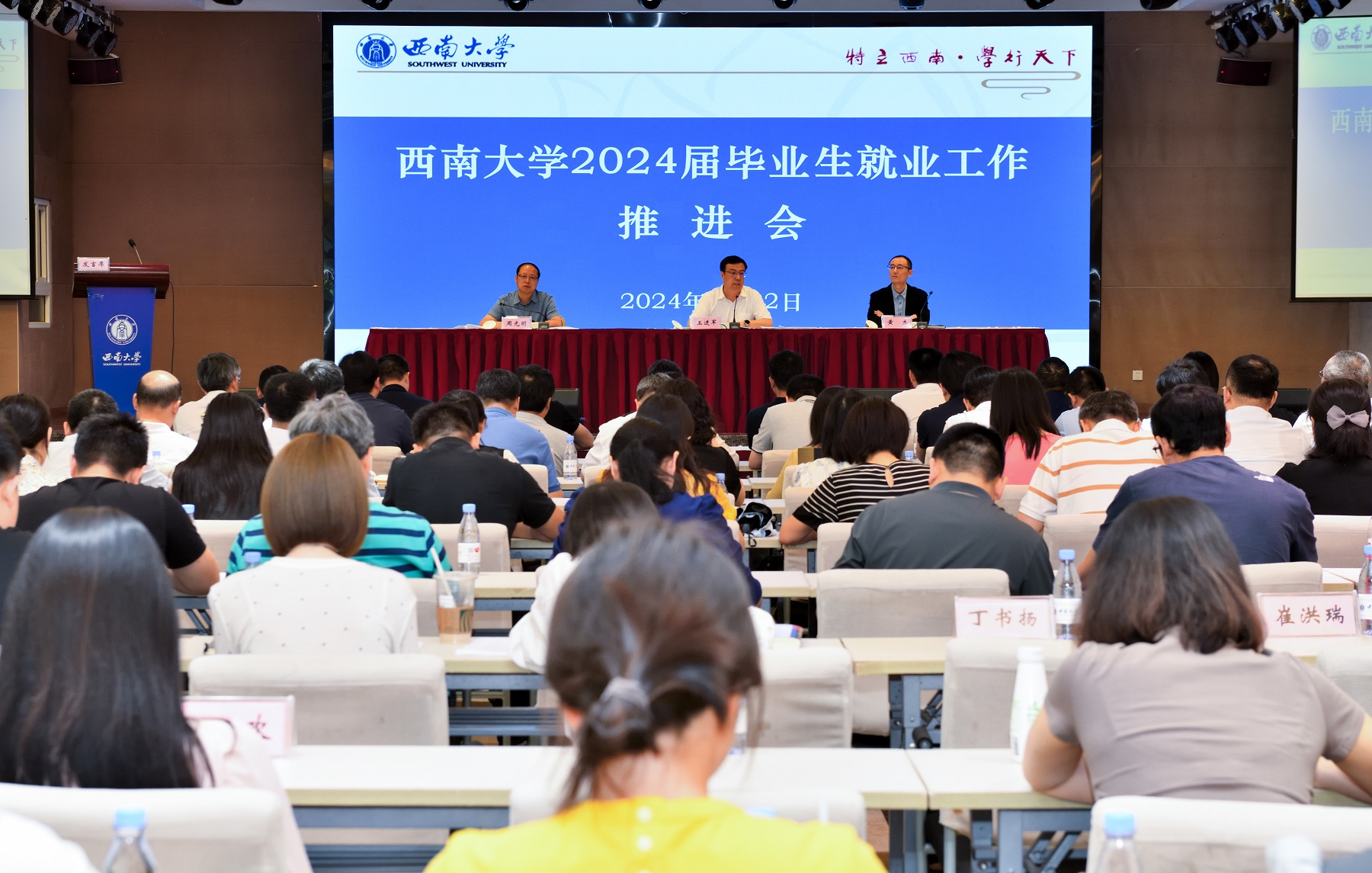 5月22日下午,学校在国际学院报告厅召开2024届毕业生就业工作推进会,校长王进军、党委副书记黄杰、副校长周光明出席会议,学校毕业生就业创业工作领导小组成员单位主要负责人、各二级培养单位党政主要负责人、分管就业工作负责人和全体毕业年级辅导员200余人参加会议。