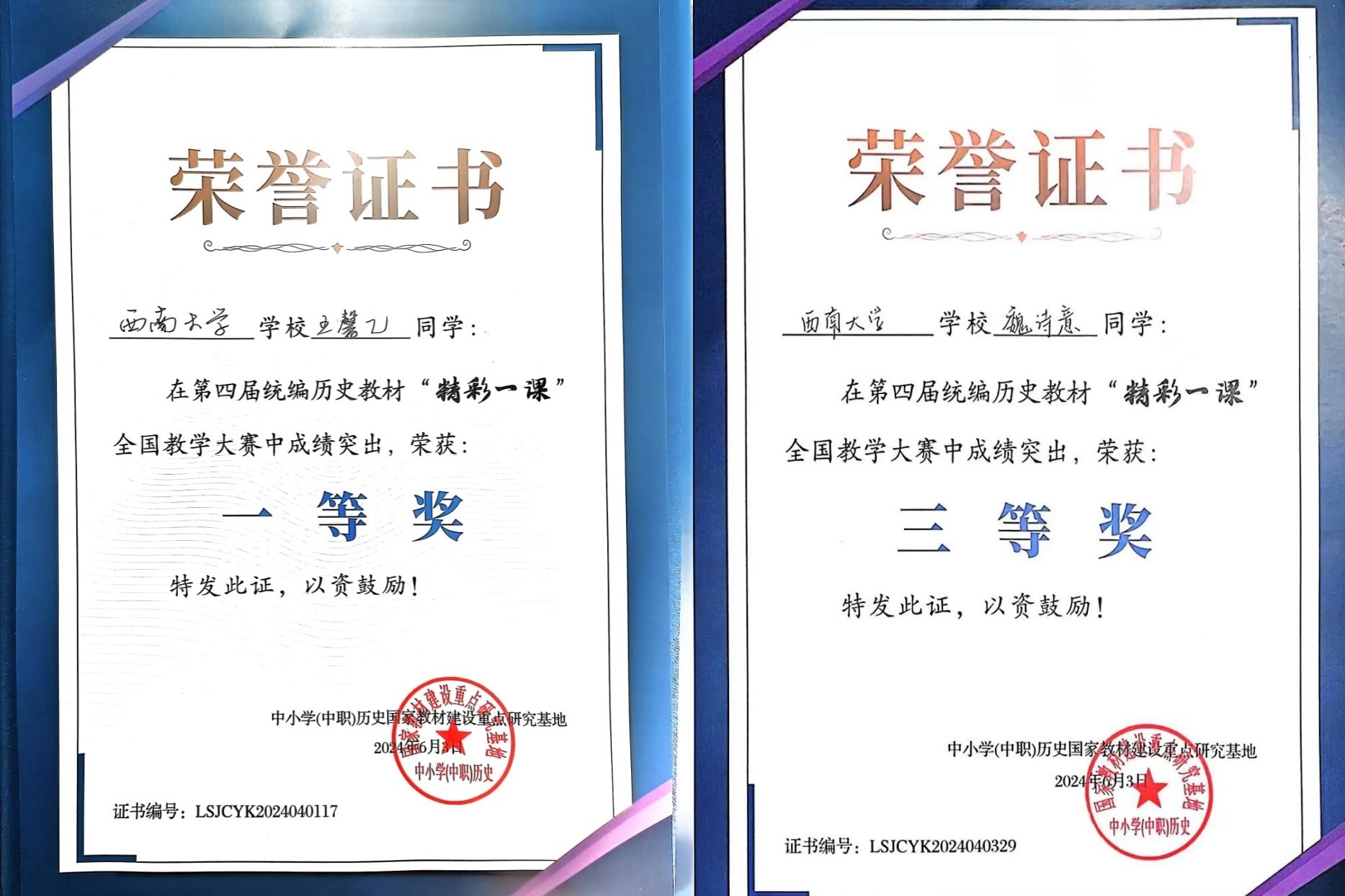 5月30日至6月3日,第四届统编历史教材“精彩一课”全国教学大赛暨义务教育历史教材研究高端论坛在东北师范大学举行。本次大赛由中小学(中职)历史国家教材建设重点研究基地主办,东北师范大学历史文化学院承办,共有来自北京师范大学、华东师范大学、贝博艾弗森代言体育官网等70余所高校的150名同学参赛。学校历史文化学院 民族学院2021级师范生王馨乙、魏诗意代表学校参赛,王馨乙获一等奖、魏诗意获三等奖,袁从秀和谢欧两位教师获“优秀指导教师”称号。