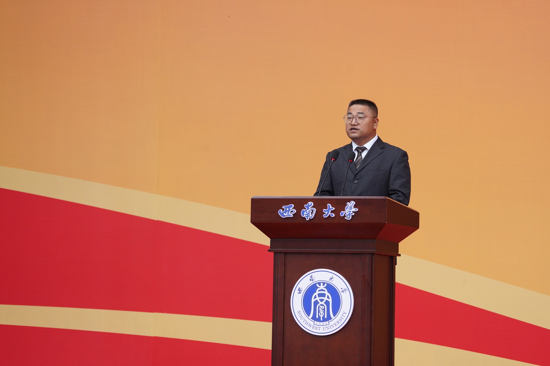 校友代表,食品科学学院2010届毕业生、綦江区横山镇新寨村党总支第一书记,“重庆市最美基层高校毕业生”乔利有分享了自己深入农村,服务基层动人故事,鼓励毕业生要脚踏实地,将自己的理想与国家的需要和人民的实际相结合,做有意义的事,书写属于自己的时代华章。