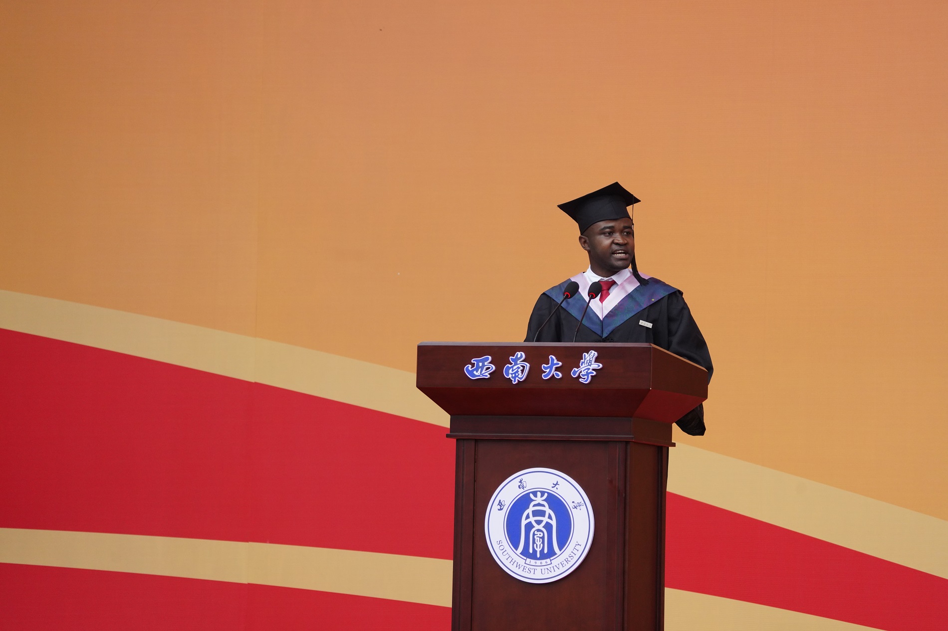来自刚果(布)的毕业留学生代表、国际学院谢天一分享了自己因中非情谊结缘中文、深入乡村用镜头讲述中国故事的难忘经历,号召留学生们当好中外友好交流合作的桥梁,携手共建人类命运共同体。