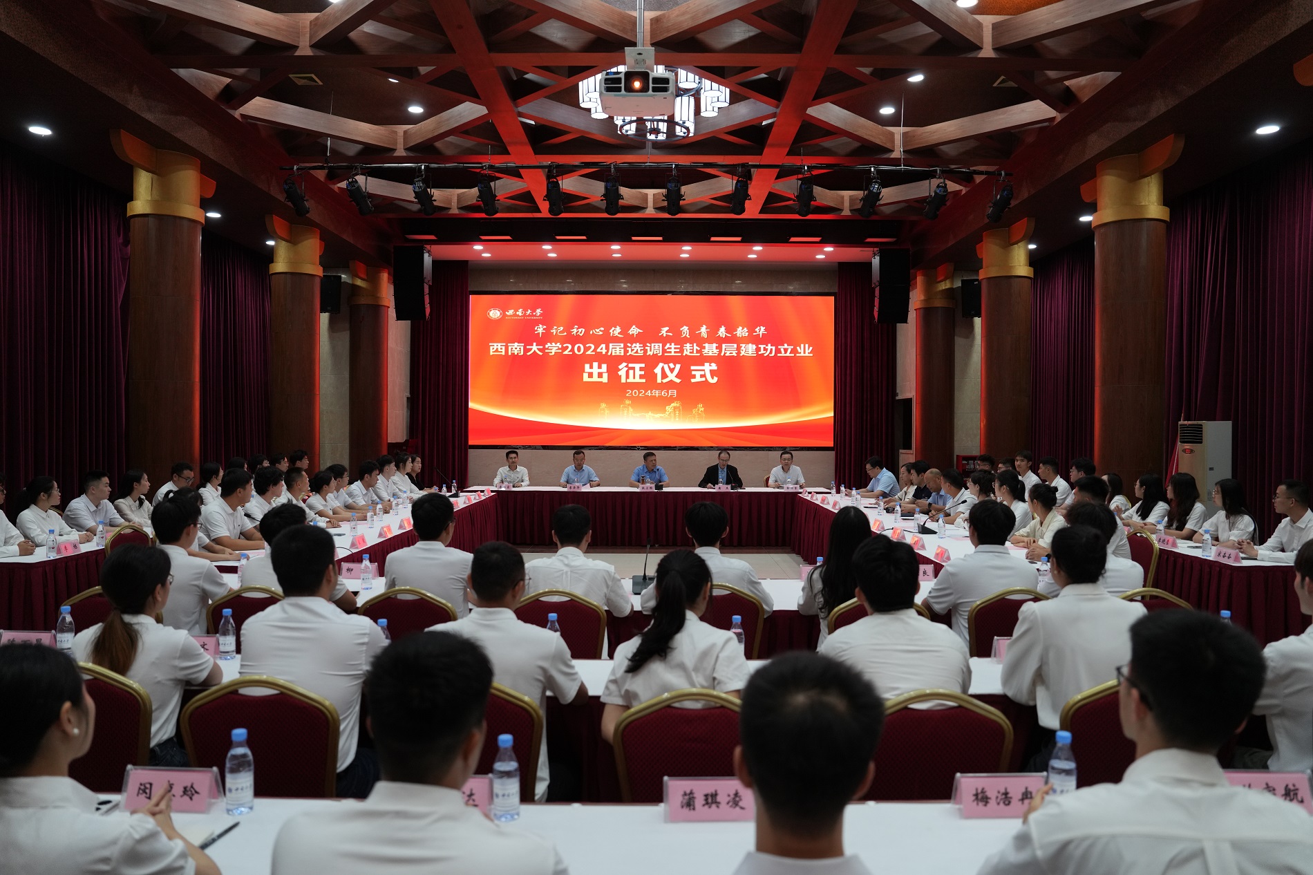 6月19日,学校在东方红会议厅举行2024届选调生赴基层建功立业出征仪式。党委书记张卫国,党委副书记黄杰,党委常委、组织部部长李荣华出席仪式,党政办公室、招生就业处等部门负责人、2024届选调生代表和特邀校友参加仪式。黄杰主持仪式。