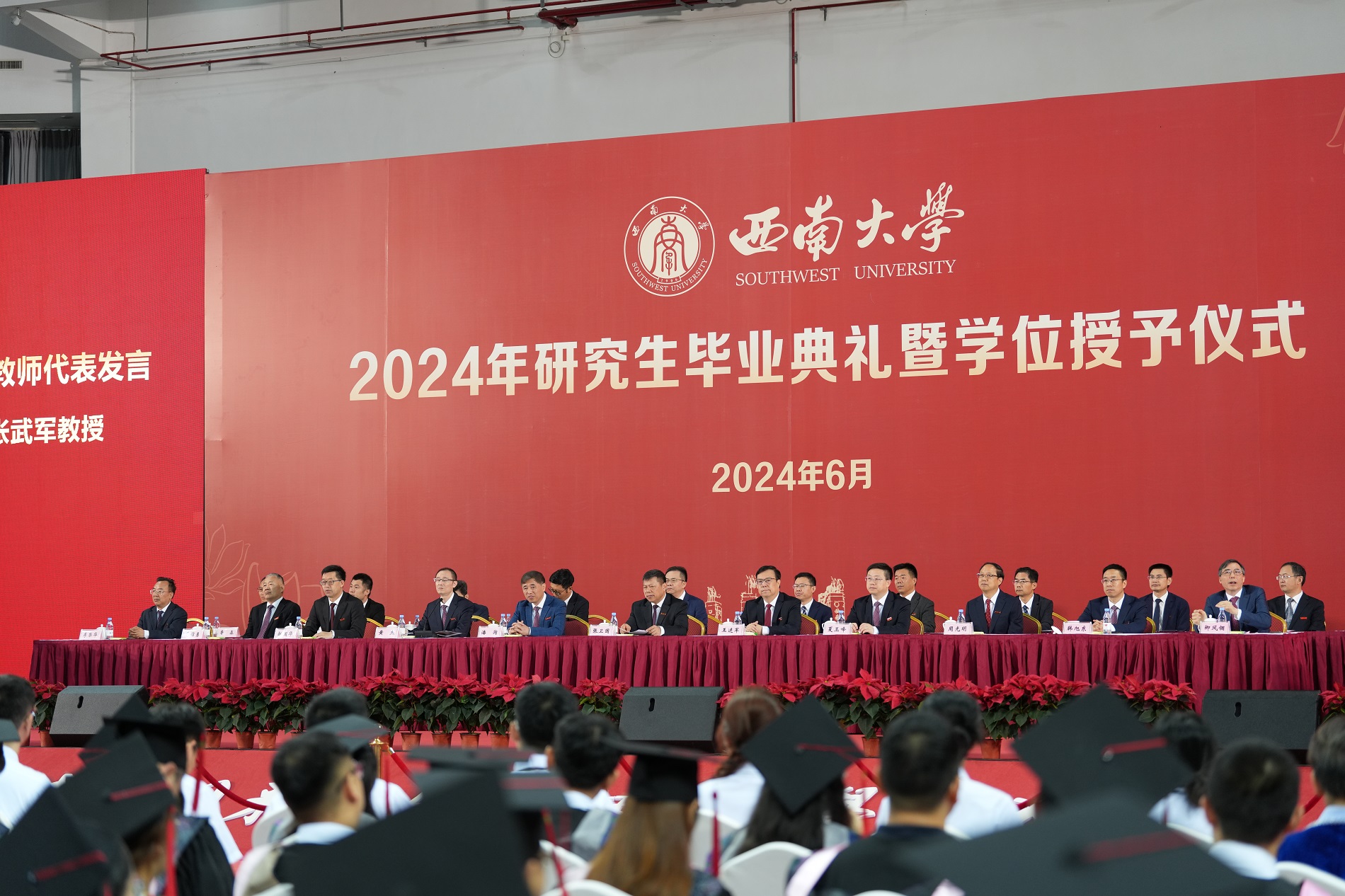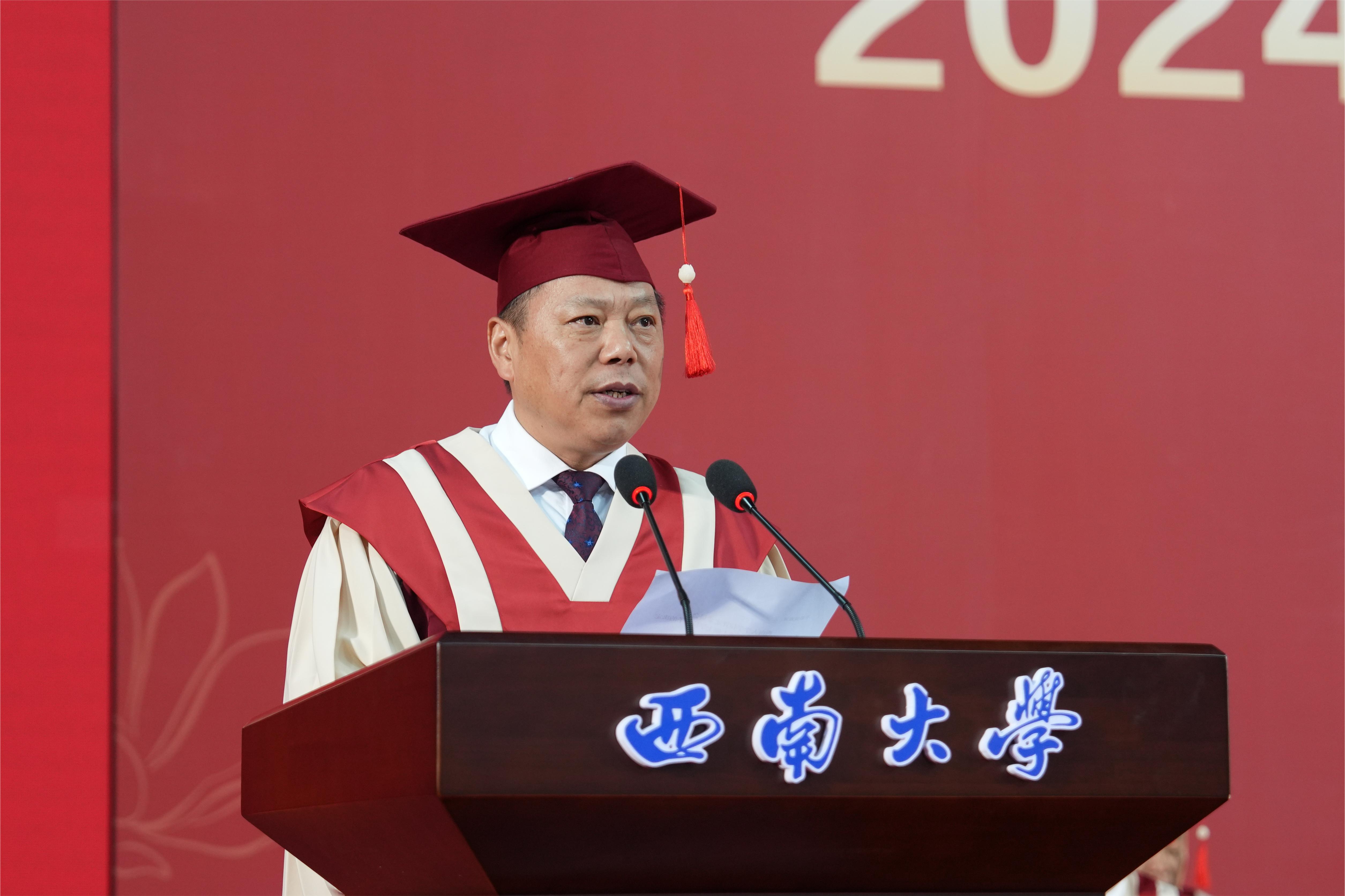 数载潜心求学,今朝拨穗正冠。6月21日上午,学校在中心体育馆举行2024年研究生毕业典礼暨学位授予仪式。校领导、党委常委,学校学生工作领导小组成员单位主要负责人,各研究生培养单位相关负责人、毕业研究生指导教师代表、辅导员、教学秘书,毕业研究生亲属以及博士、硕士学位获得者参加典礼。党委副书记潘洵主持授位仪式,党委副书记黄杰主持毕业典礼。