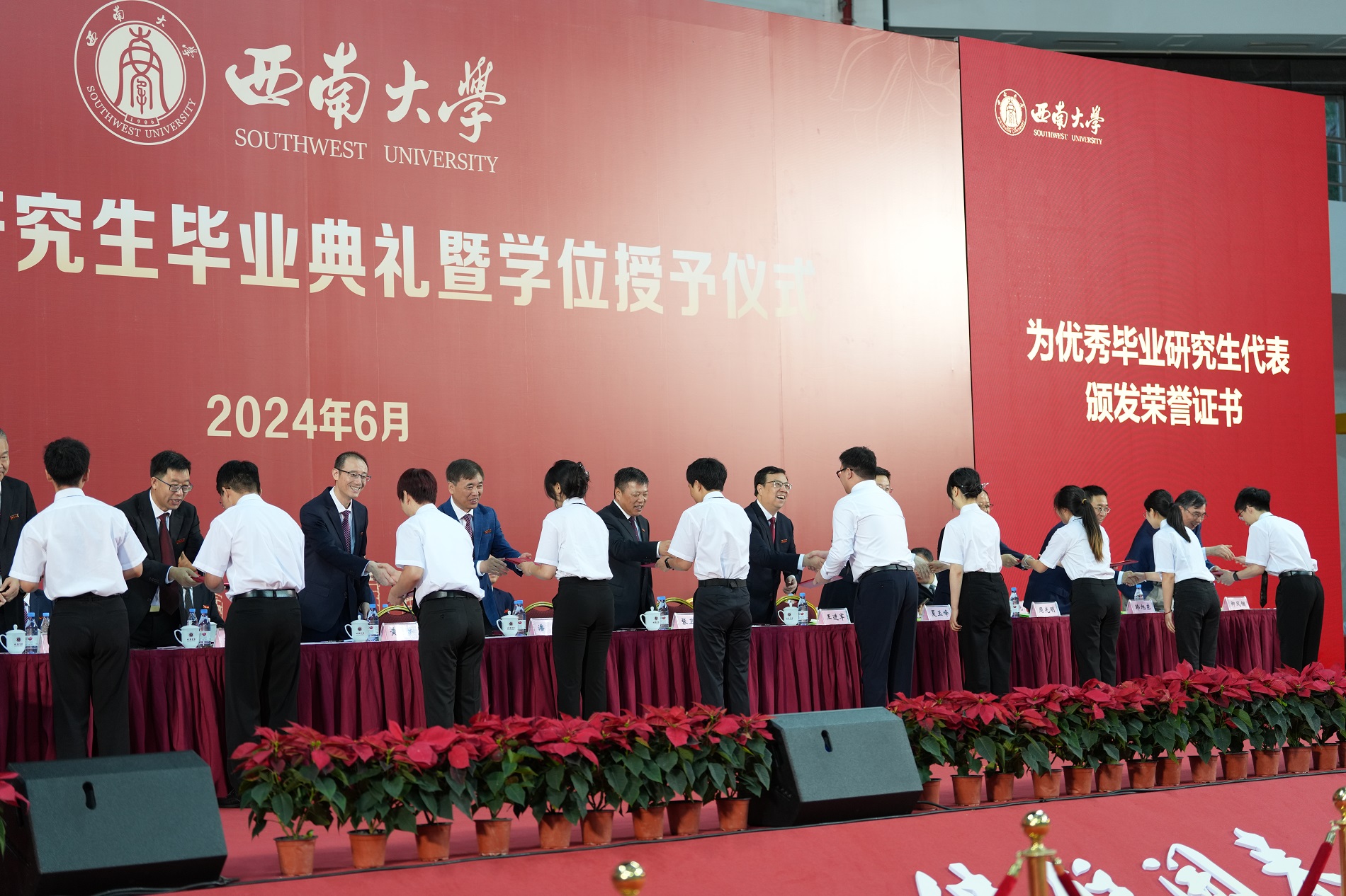 学校为毕业研究生代表颁发毕业证书,为重庆市优秀毕业研究生代表、学校优秀毕业研究生代表和优秀研究生学位论文获奖代表颁发荣誉证书。