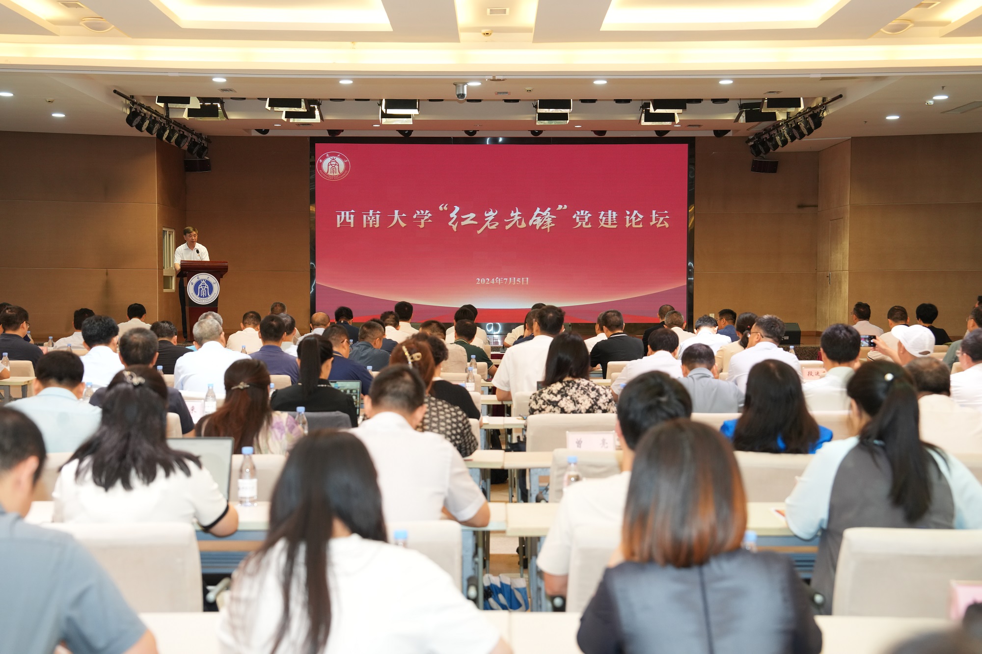 为推进新时代“红岩先锋”变革型组织建设,落实“红岩先锋”基层党组织“五高”建设计划,提升党务工作队伍建设水平,营造争先创优、赛马比拼的氛围,全面促进党建工作提质增效,以高质量党建引领事业高质量发展,7月5日,学校党委举办“红岩先锋”党建论坛,党委书记张卫国,校长、党委副书记王进军等全体在家校领导出席论坛,党委常委,二级党组织书记,机关部门、直附属单位、企业单位主要负责人,学院(部、所)院(部、所)长,全体组织员及党支部书记代表参加论坛。论坛由党委副书记潘洵主持。