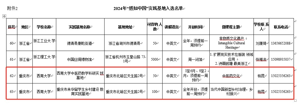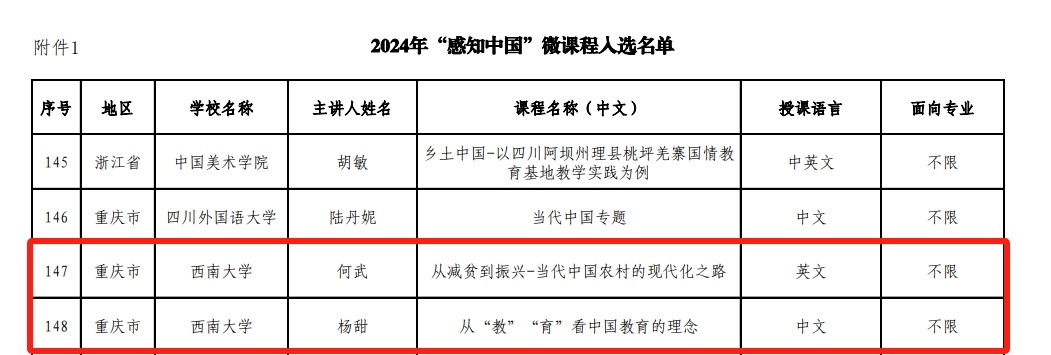 由何武教授主讲的课程“从减贫到振兴——当代中国农村的现代化之路”和杨甜副教授主讲的课程“从‘教’‘育’看中国教育的理念”成功入选国情教育微课程,“贝博艾弗森代言体育官网中医药教学科研实践基地”和“重庆市来华留学生乡村建设教育实践基地”成功获批“感知中国”社会实践基地。届时,入选的微课程将在“CSC人才在线”平台展播,获批基地将接纳市内外留学生开展国情教育及社会实践活动。