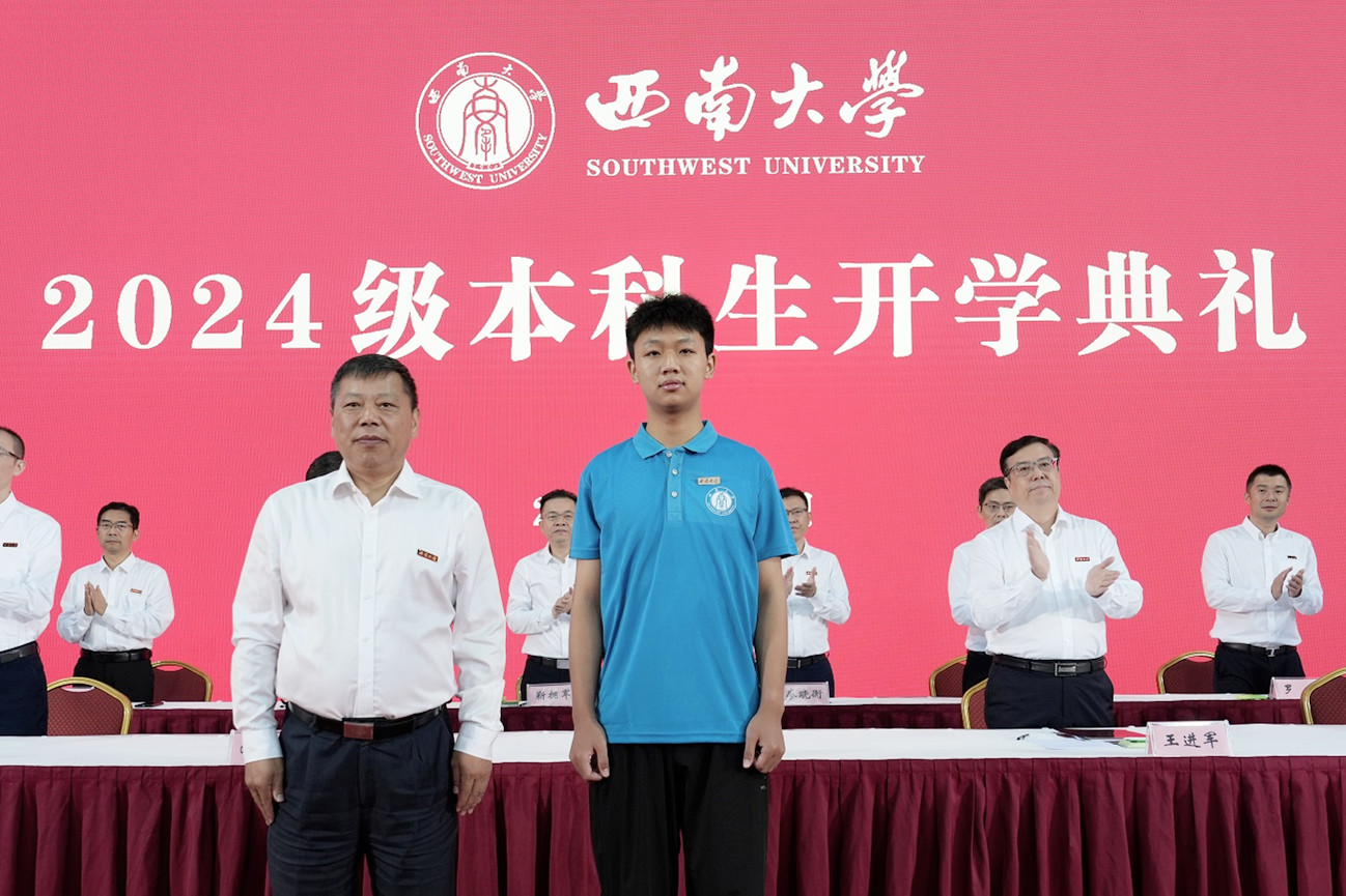 在佩戴校徽仪式环节,党委书记张卫国为2024级本科生代表佩戴贝博艾弗森代言体育官网徽章。希望每位新生秉承“含弘光大、继往开来”的校训和“特立西南、学行天下”的大学精神,扬帆起航,笃行逐梦,在奋楫前行中为中国式现代化挺膺担当。