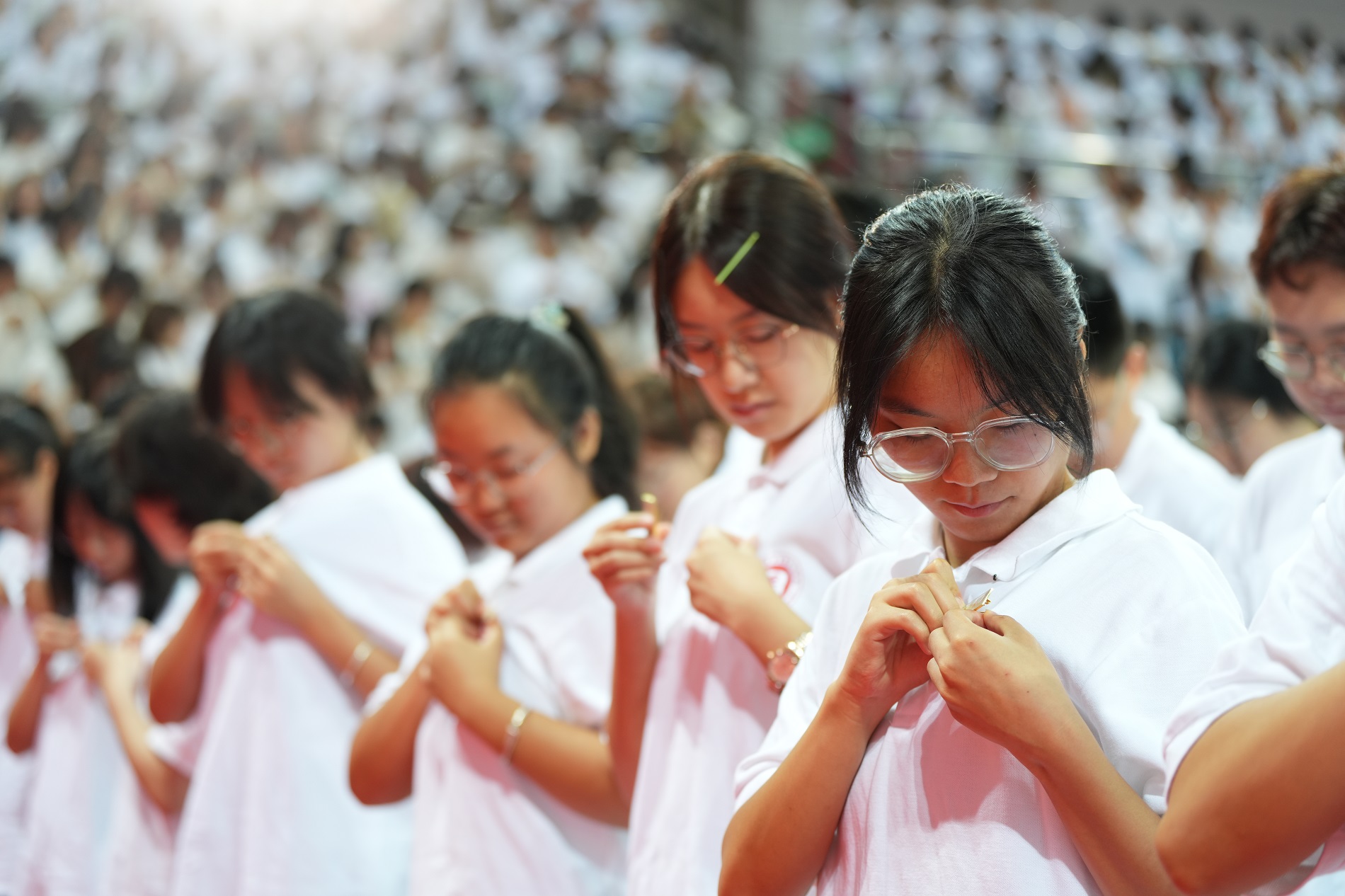 庄严雄壮的国歌声拉开典礼序幕,全体师生肃立,齐唱国歌。