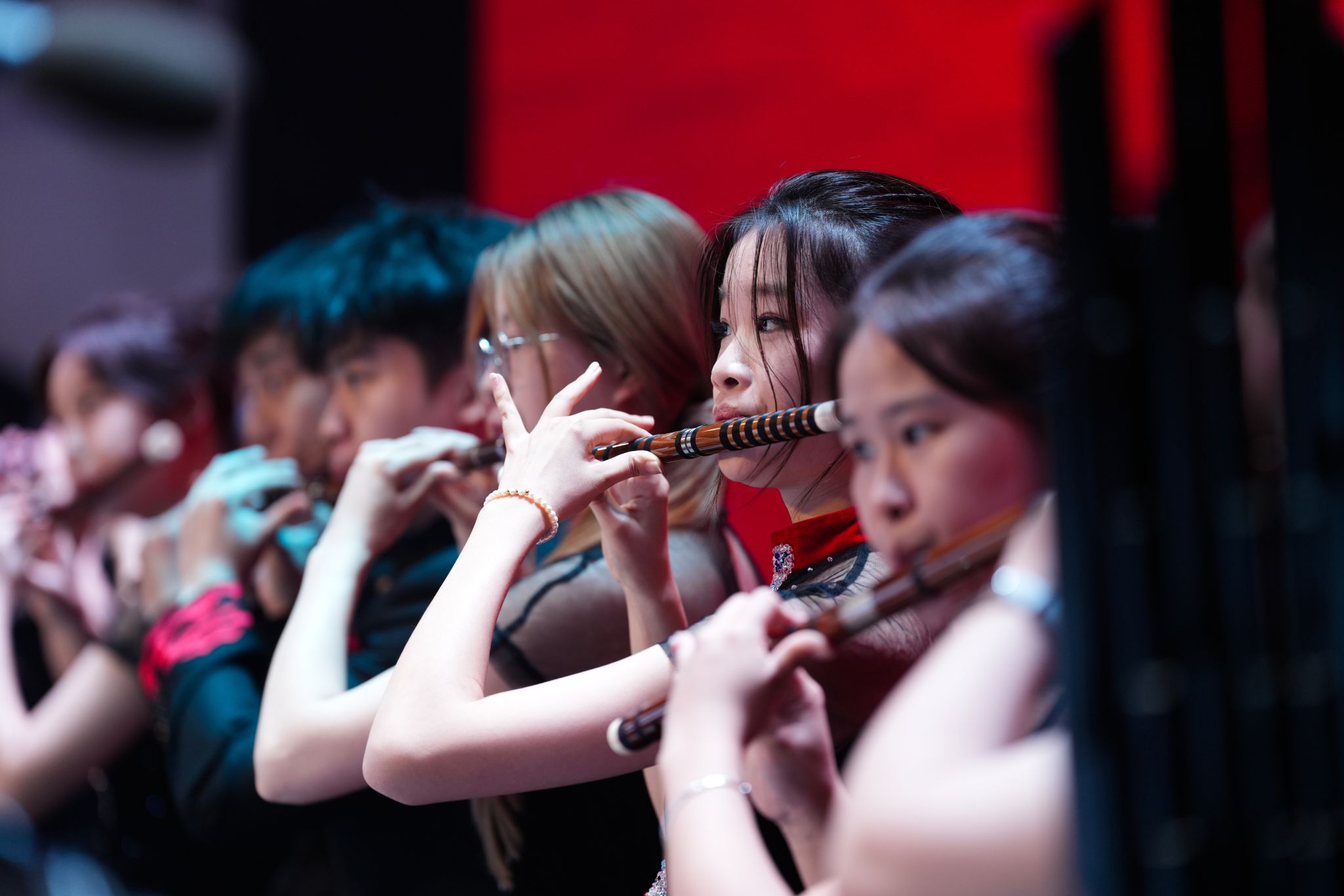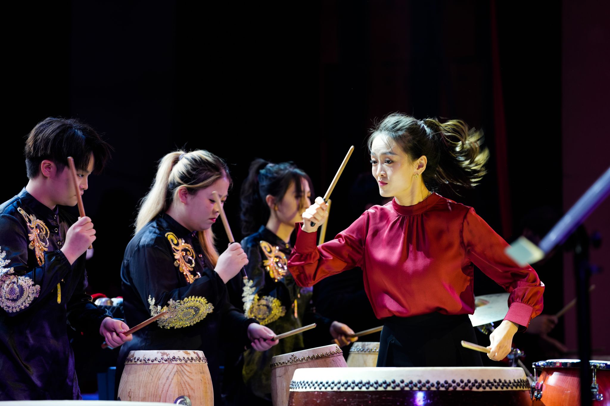 第二篇章由青年教师陈河霖、陈黎领奏的吹打乐合奏《龙腾虎跃》开篇,再次点燃了现场热情。《好儿好女好江山》描绘了一幅山河壮丽、人民幸福的美丽画卷,竹笛独奏《扬鞭催马运粮忙》用明快的旋律展示出丰收的热闹场景,青年教师马骏深情演唱的《中华我的家》诉说着对中华大地的无尽眷恋。