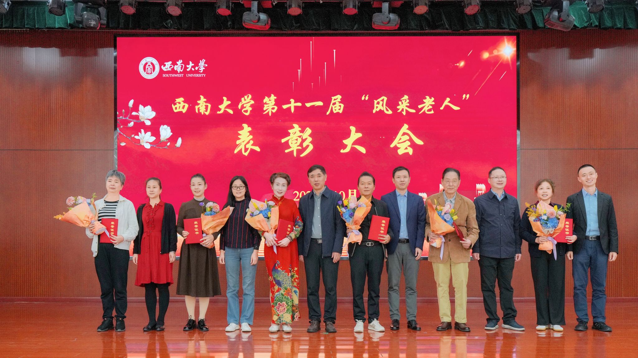 10月9日,学校举行第十一届“风采老人”表彰大会,党委副书记潘洵出席并讲话。党政办公室,党委组织部,人力资源部,离退休党委、离退休工作处等单位负责人,以及受表彰老同志、离退休教职工代表共计100余人参会。会议由离退休工作处处长鲁森主持。