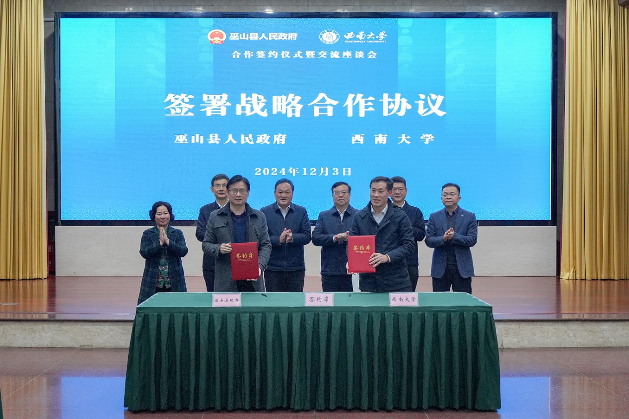 曹邦兴介绍了巫山县围绕抓好山清水秀美丽之地建设、乡村全面振兴“两件大事”,打造世界级知名旅游目的地、全国优质生态产品供给地、产城景融合三峡港湾城、多式联运商贸物流枢纽“四张名片”取得的新成效。他代表巫山县感谢学校为巫山县打造特色发展路径特别是建设农业强县提供的有力支持。期待在特色农产品加工、人才引进推荐和培育、教育发展共同体建设等方面深化合作,持续推动巫山教育与农业产业高质量发展,为建设山区库区强县富民现代化示范县提供坚实支撑。
