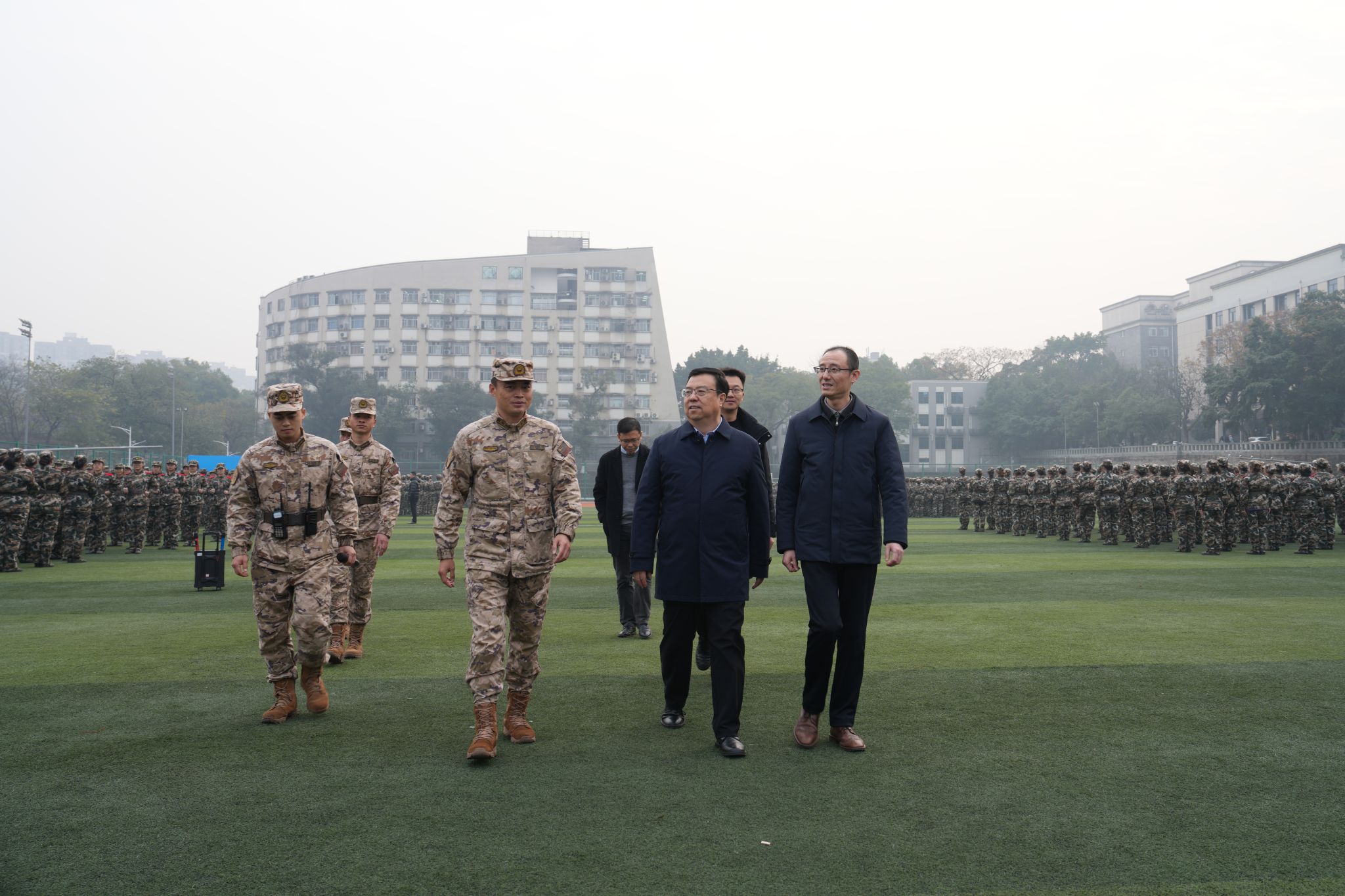此外,一行还视察了军训后勤保障、医疗服务等工作。王进军强调,相关职能部门要高度重视教官和学生的安全健康,做好冬训物资保障供应工作,确保军训圆满成功。