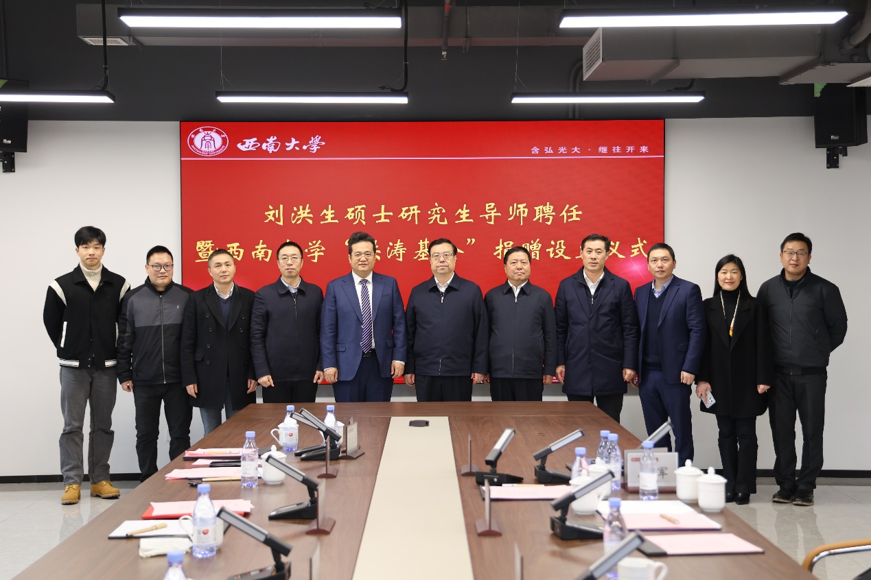 王进军热烈欢迎刘洪生加入学校导师队伍,同时向刘洪生和董涛江先生致谢。他谈到,此份善举尽显情怀与担当,将点燃更多的梦想和希望,期望广大学子感恩奋进,传承爱心,共同为强国建设、民族复兴伟业贡献力量。
